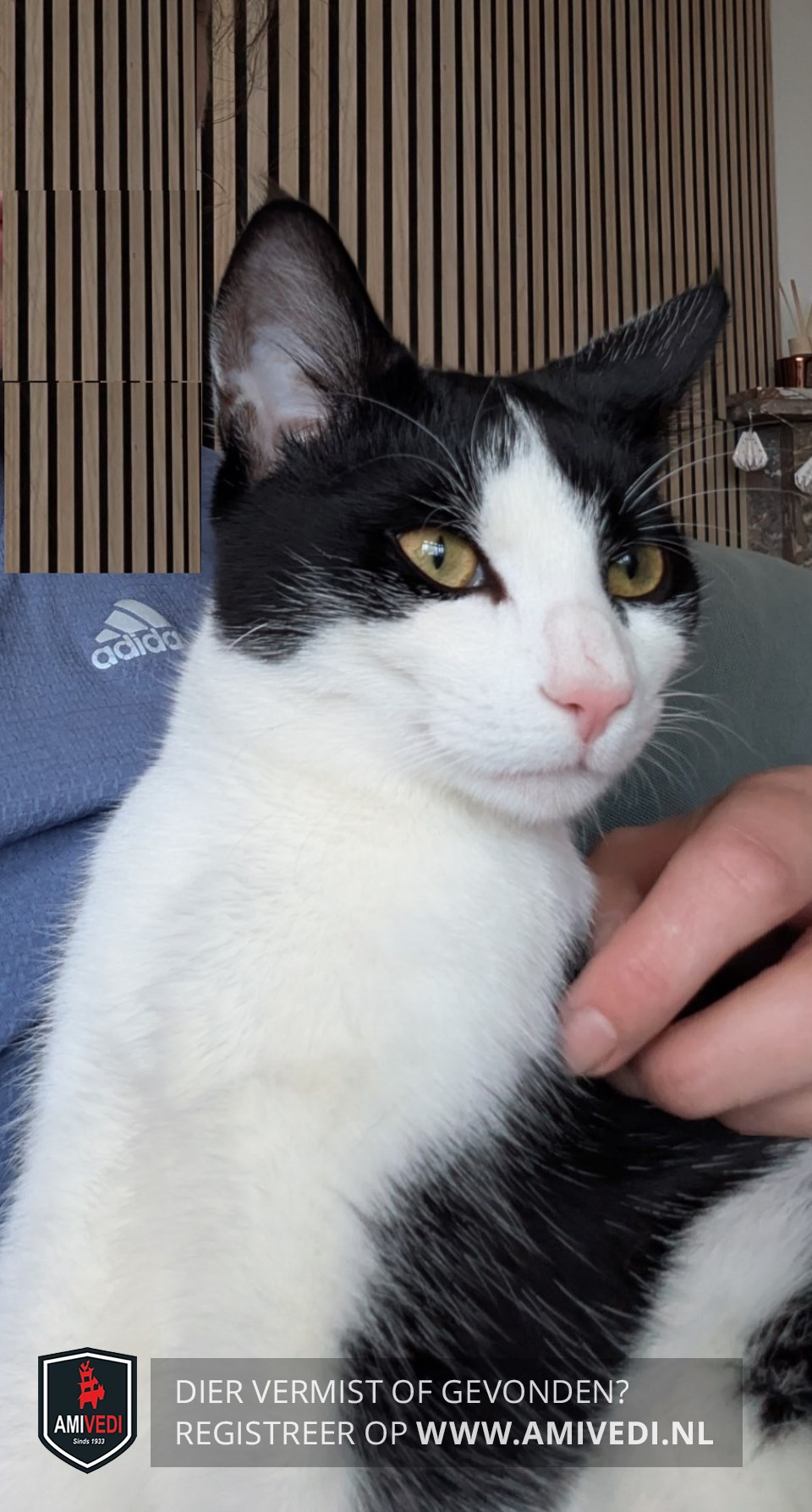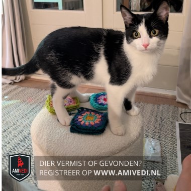| Signalement | Zwart-wit: zwart bovenop het kopje tot net onder de ogen, rug en flanken grotendeels zwart met witte 'inhammen'. Voorpoten zijn wit, met bij de linkervoorpoot net boven de teentjes een zwart vlak aan de achterzijde; rechterachterpoot witte laars, daarboven zwart. Zwarte staart. Wit op de neusbrug tot bijna tussen de oren, witte snoet, kin, nek, hals, borst en buik. |