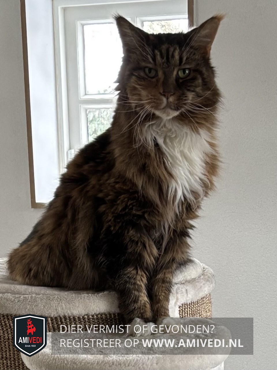 | Signalement | Geheel bruin/zwart en rood gemêleerd met een witte kin, bef en borst, Beide voorpoten hebben witte tenen. schildpad patroon |