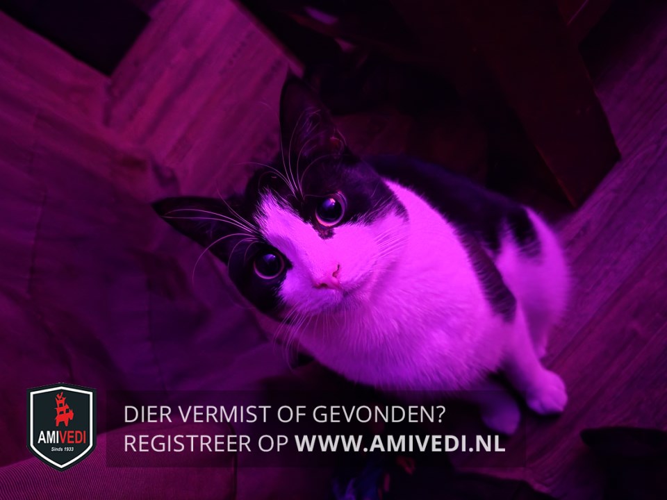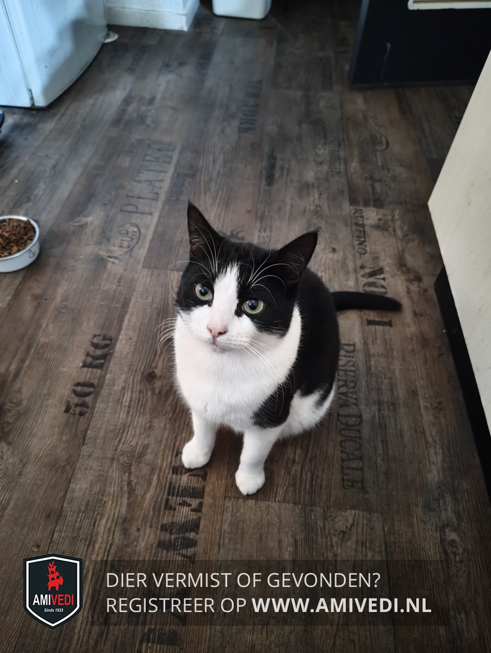 | Signalement | Niet gewend aan buiten. Tuxedo kat. Met witte snoet en bles, witte hald en borst en witte poten |