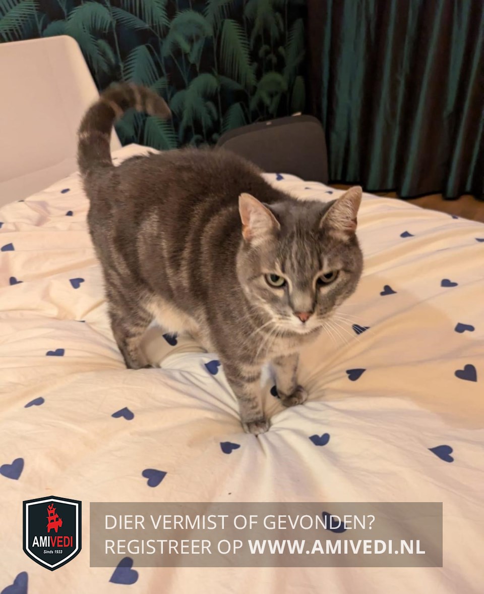 | Signalement | Lichte cypersgrijze poes met lichte bek en buik. |