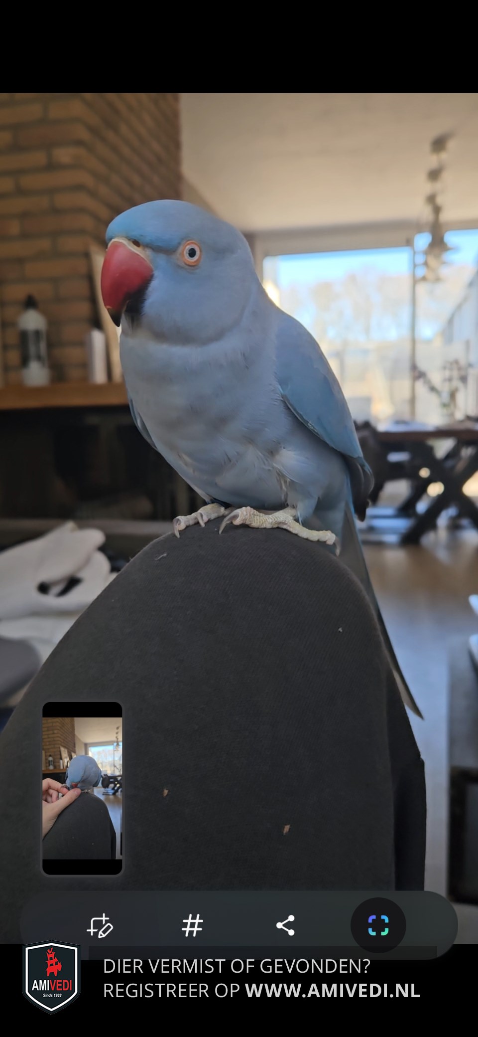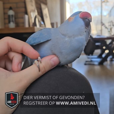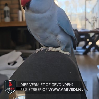 | Signalement | Een volledig blauwe halsbandparkiet. Haar naam is Blue, maar ze reageert beter op "Kiekeboe". |