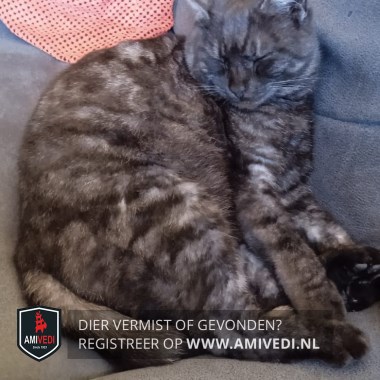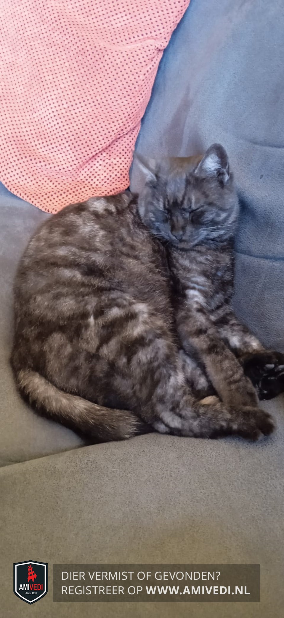 | Signalement | Egaal zwarte poes , lijkt op antraciet, doordat de vacht erg dik is , buitenkat altijd geweest. |