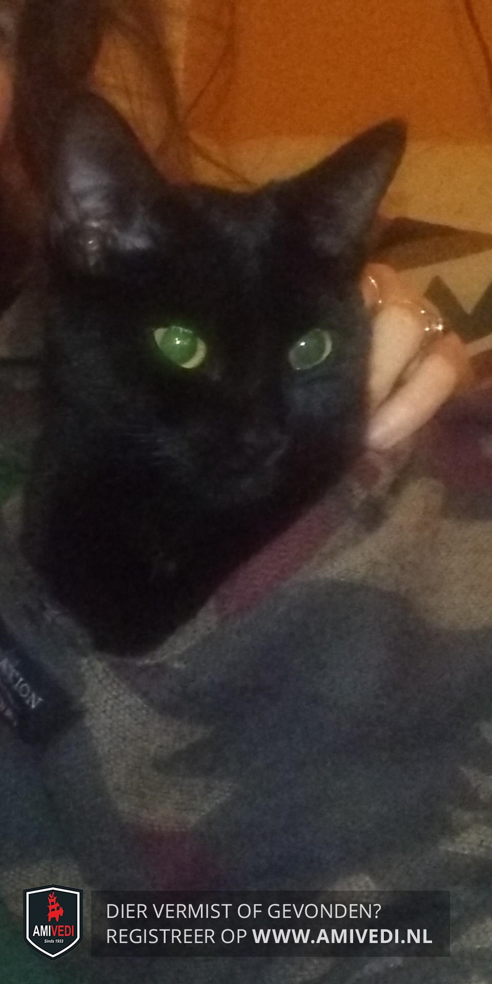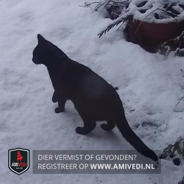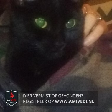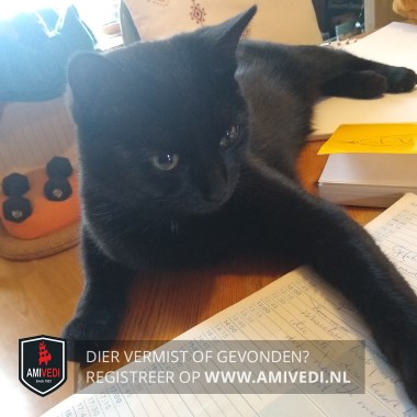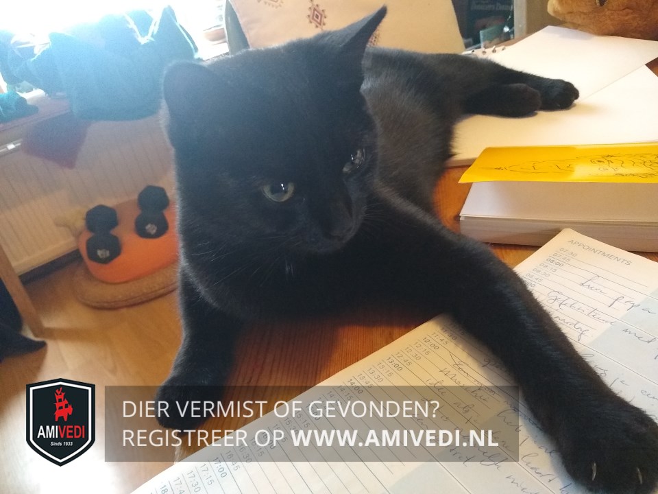 | Signalement | Geheel zwarte kater met enkele nauwelijks zichtbare witte haartjes op de borst. Redelijk groot voor zijn leeftijd. Geel/ groene ogen. |