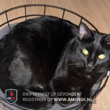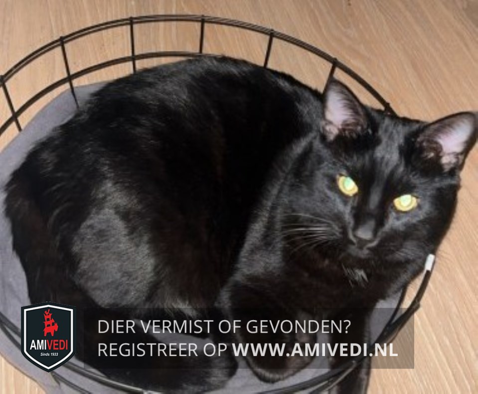 | Signalement | Klein beetje wit op de borst, verder geheel zwart met gele ogen. |