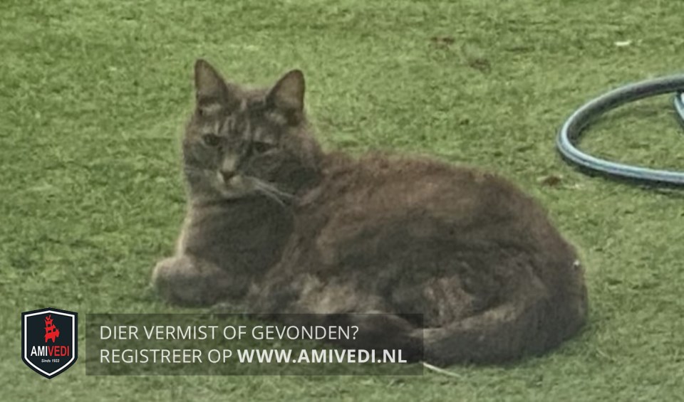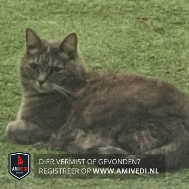 | Signalement | Cypers bruin/grijs gemêleerde poes. Wat grijs rond het bekje. Heeft lichte staar en loopt af en toe tegen wat obstakels aan. |