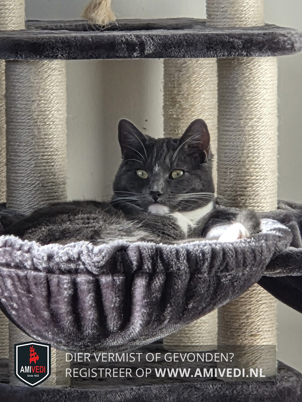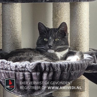 | Signalement | Grijze kop met een klein wit streepje boven de neus en tussen de ogen, witte onderlip, witte bef, borst, lijf is grijs gestreept, witte buik tussen de achter poten, voorpoten witte voetjes, achter poten witte kousen waar van de linker achter poot een grijze vlek bovenin heeft aan de binnen kant van de poot. |