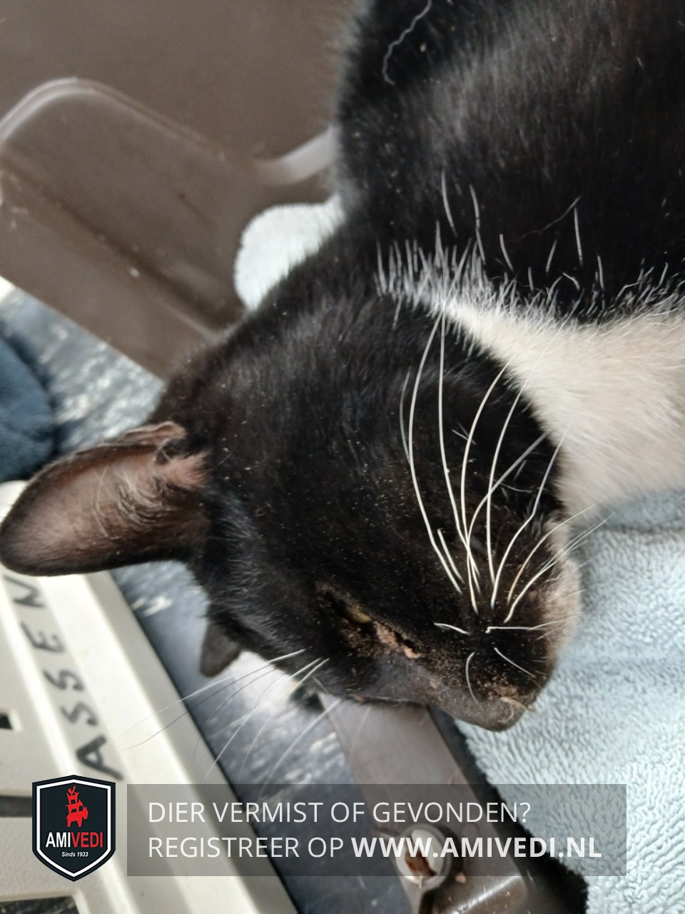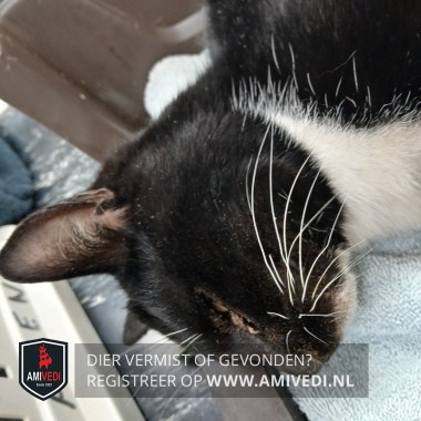 | Signalement | Zwart met witte kater. Witte kin, hals, bef, borst, voetjes voorpootjes, laarsjes achterpootjes. Kater is opgenomen bij dierenarts. |