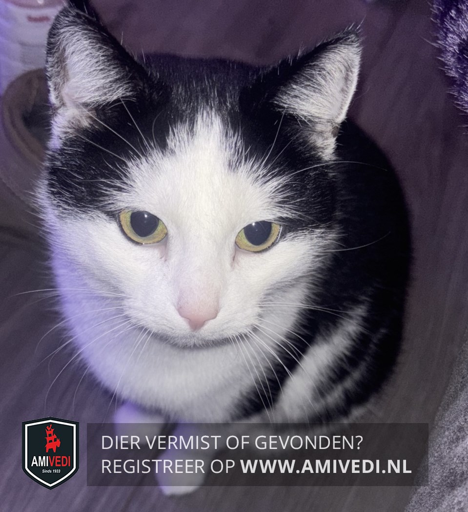 | Signalement | Zwarte oortjes en petje. Witte bles, doorlopend in een wit snuitje. Witte kin, bef, borst en buik. Witte voorpootjes. Zwarte rug en witte achterpootjes. |