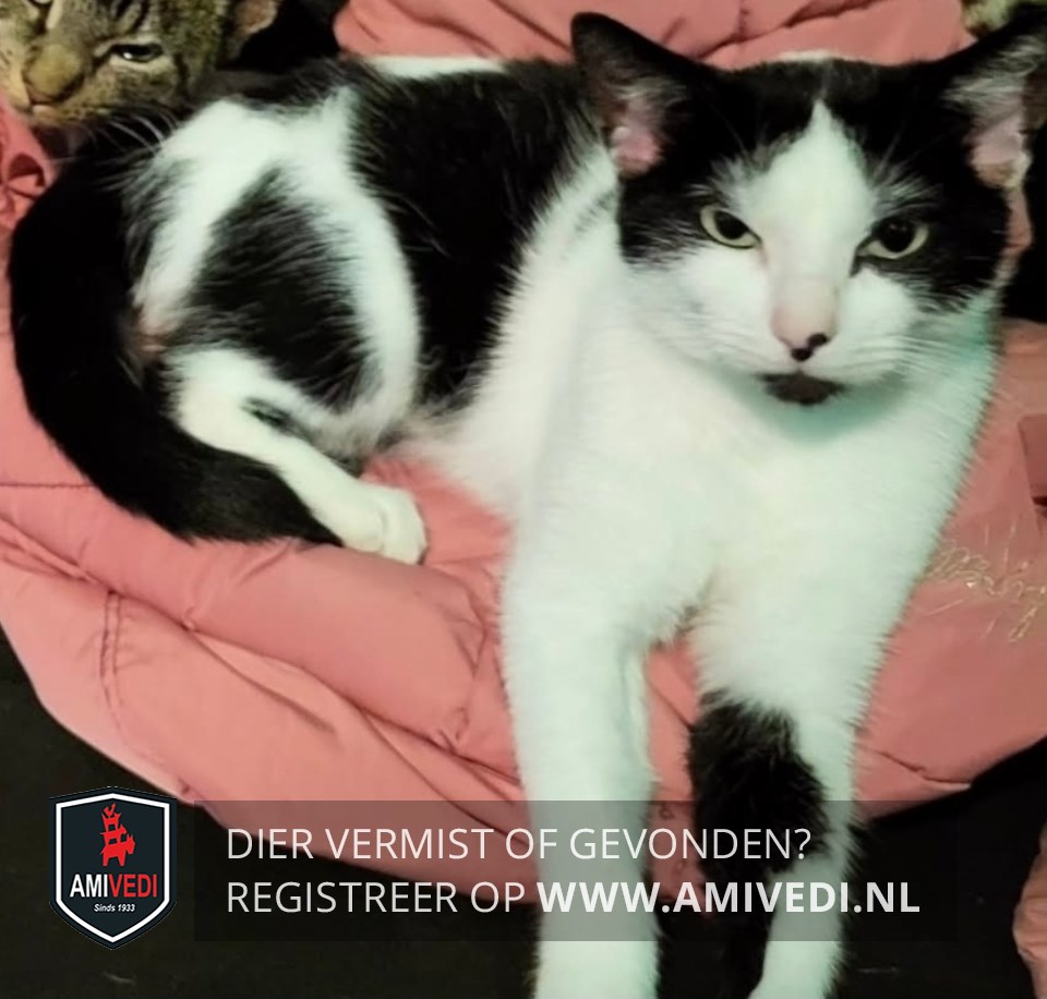 | Signalement | Zwart met wit, zwarte oren en petje, zwarte kin, zwarte vlek op linker voorpoot, zwarte rug en flank, zwarte vlek heup, zwarte staart, niet zo groot. |