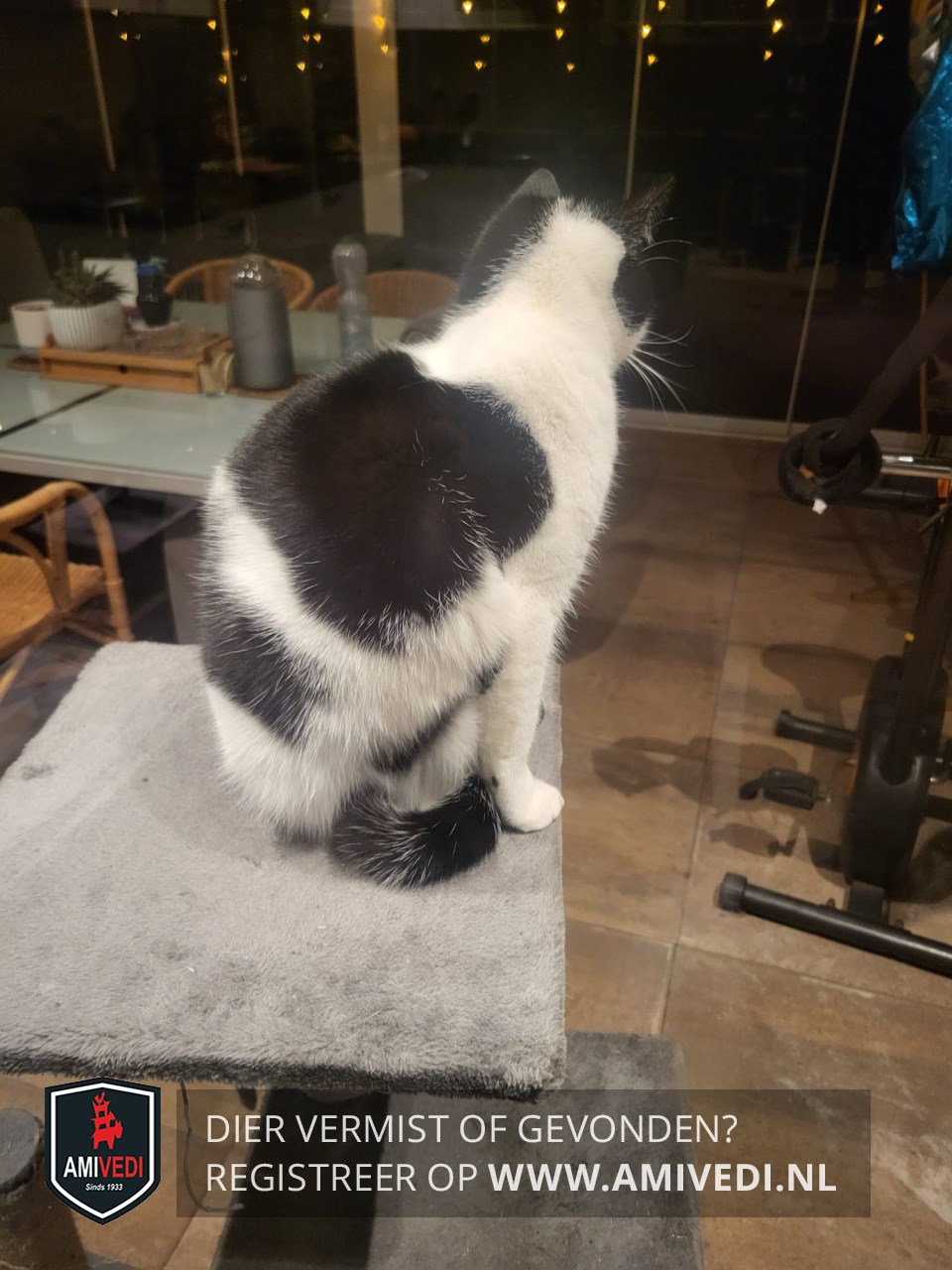 | Signalement | Zwart/wit. Witte snoet, bef borst en buik. zwart vanaf de ogen op de kop. Hoofdzakelijk witte poten. Zwart-wit gevlekte rug. Zwarte staart met een witte ring. |