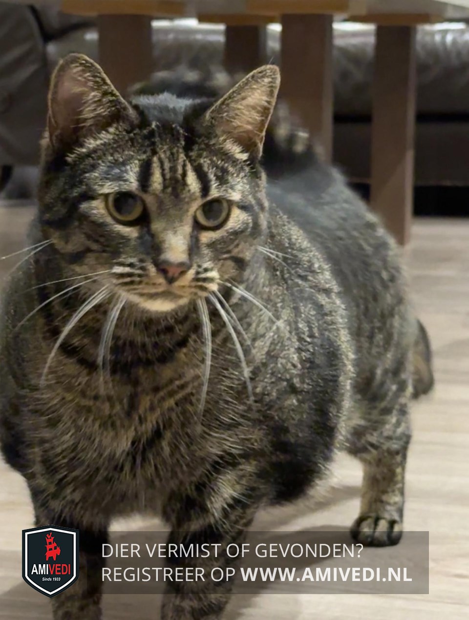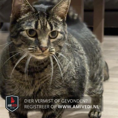 | Signalement | Cypers bruin zwart gestreepte poes met een beetje wit aan de kin, voor de rest geheel cypers bruin zwart gestreept. |