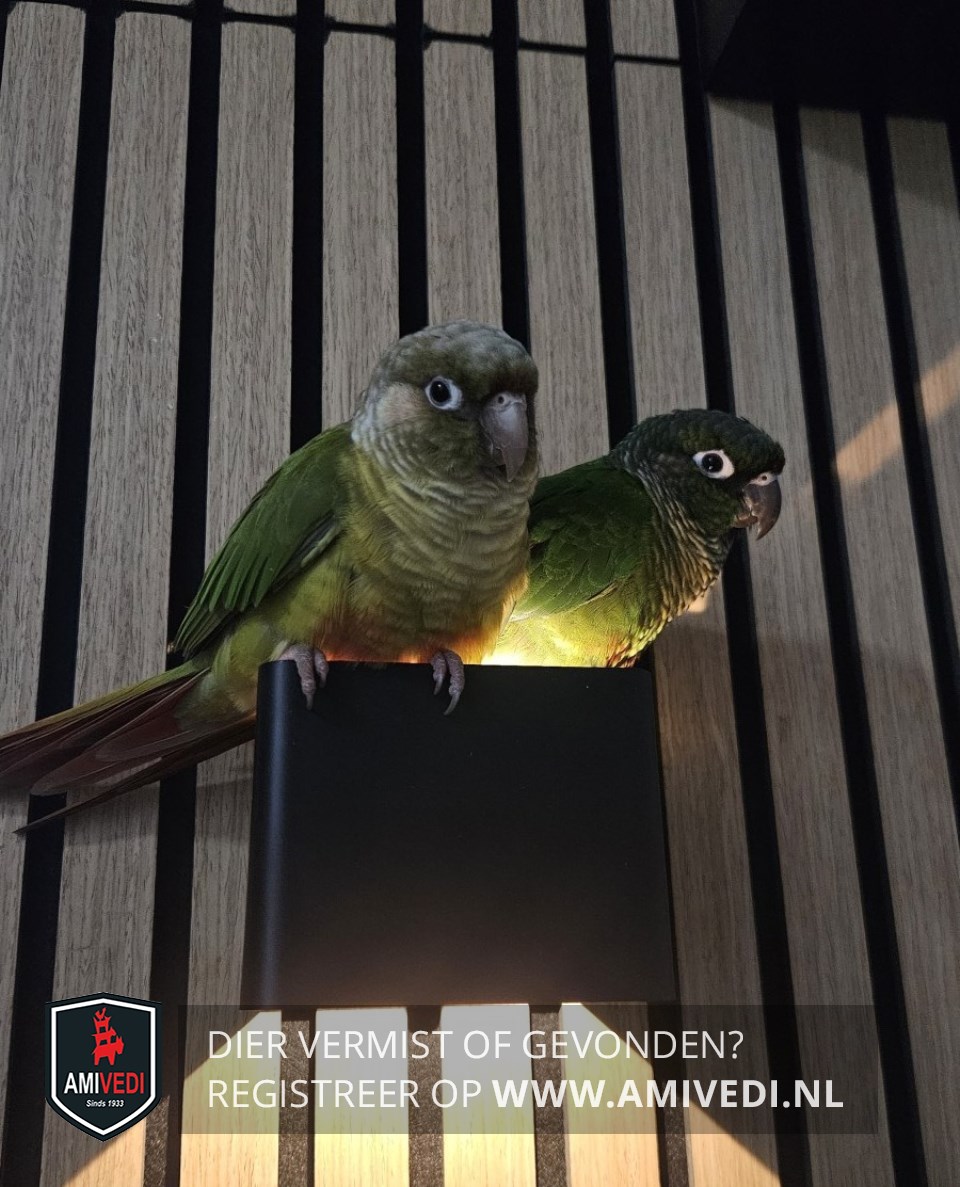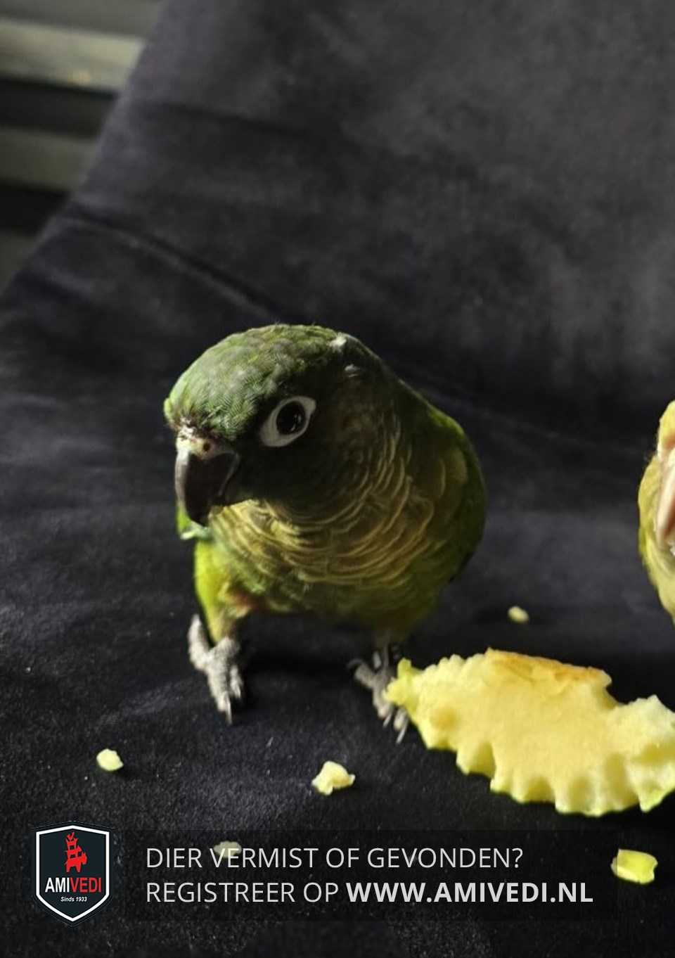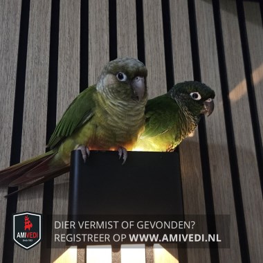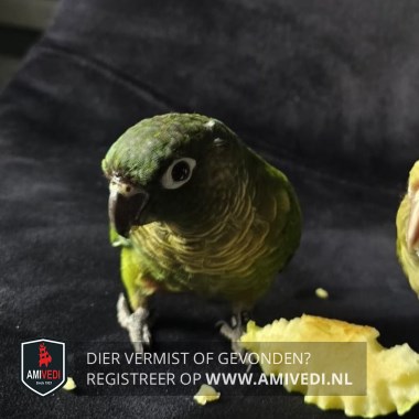 | Signalement | Groen wang pyrhurra grijze snavel en grijze voeten, heeft een zwart ring om zijn linkerpoot, hij is met een gele cinnamon pyrhurra |