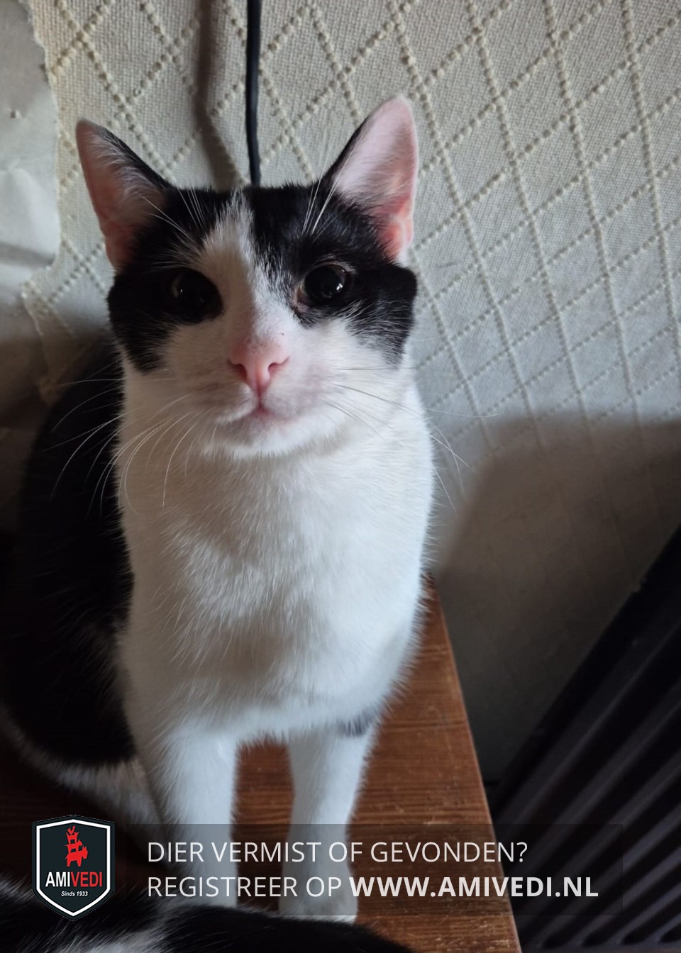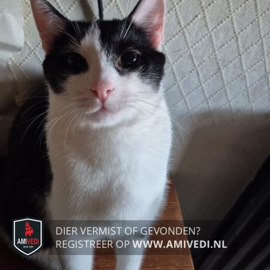 | Signalement | Wit/zwarte ongecastreerd katertje. Zwart op het kopje dat doorloopt over en langs de oogjes. Roze oortjes. Wit neusje dat doorloopt over het voorhoofd. Verder wit snuitje, roze neuspunt, witte borst en buik. Zwart dek op de rug en zijden. Witte pootjes. |
