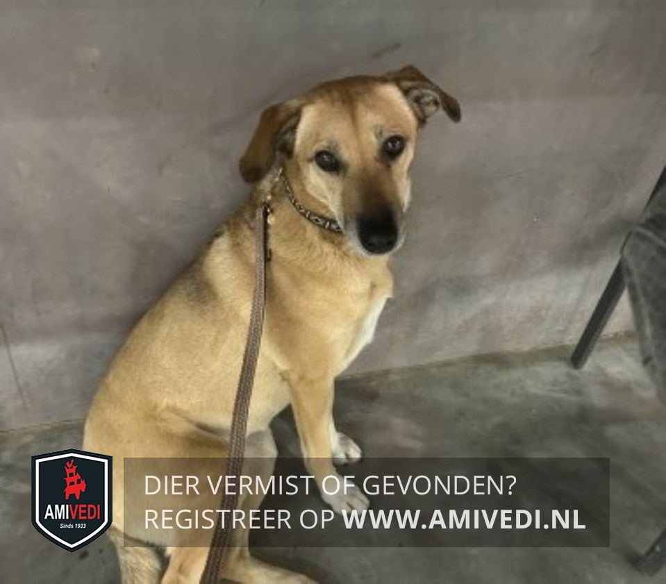 | Signalement | Hond beige/blonde kruising, teef. Spitse snuit iets bruin met iets wit. Bruine hangende oren, grote bruine ogen. Op de borst wit en de voorpoten witte sokken. |