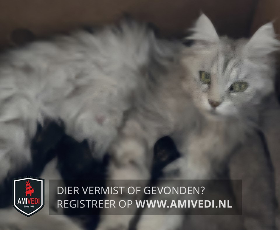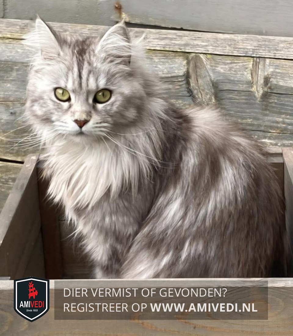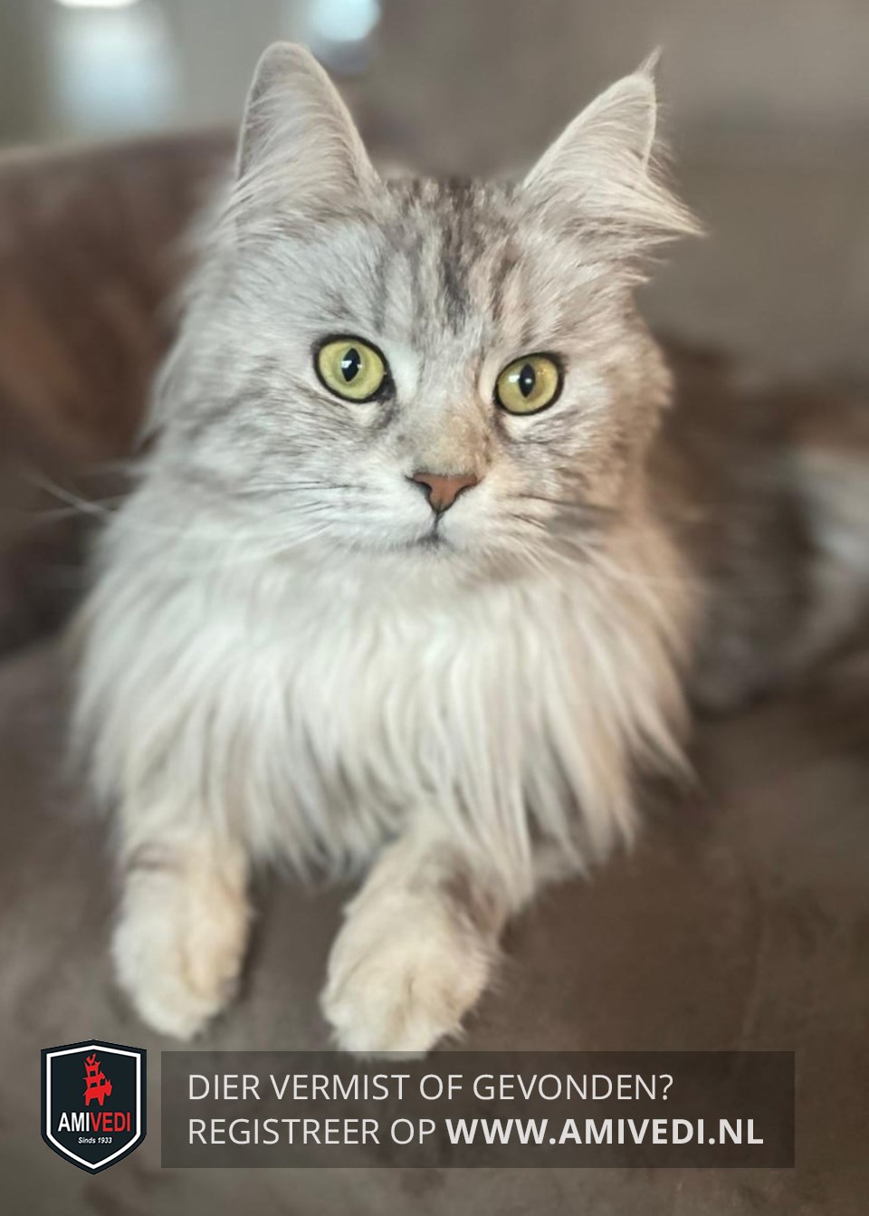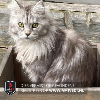 | Signalement | Cypers zwart/zilver met wit gemarmerd (Black silver tabby). Langhaar. Veel haar in de oren, volle kraag en pluimstaart. |