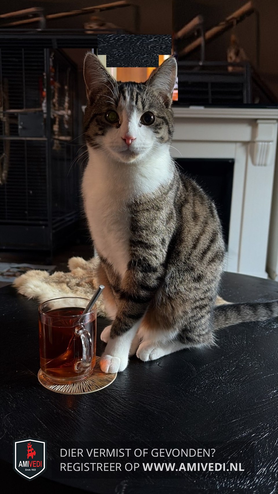 | Signalement | Grotendeels cypers grijsbruin met zwarte streepjes met daarnaast witte accenten: witte neusbrug, snoet, hals, borst, buik en sokken aan de voorpoten en kousen aan de achterpoten. LET OP: binnenkat, buiten niet gewend, loenst |