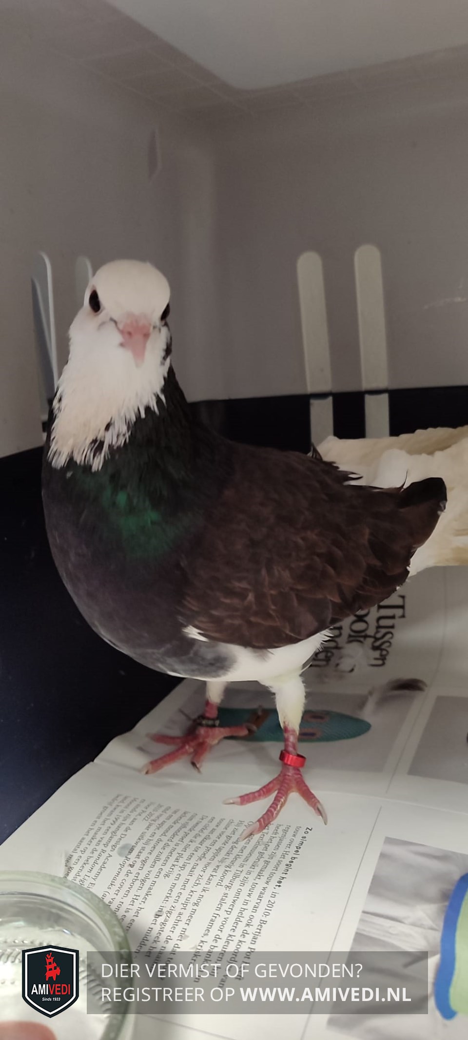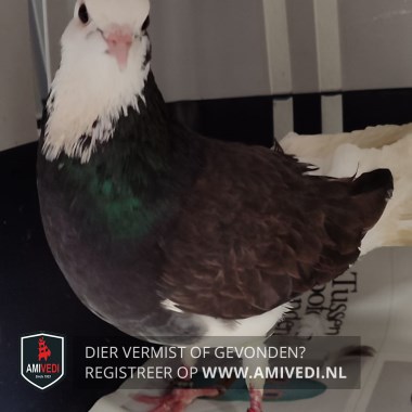 | Signalement | Sierduif, kopje en linkerpoot wit, lijf verder grotendeels donkerbruin |