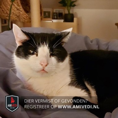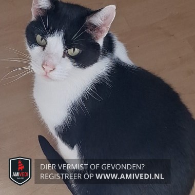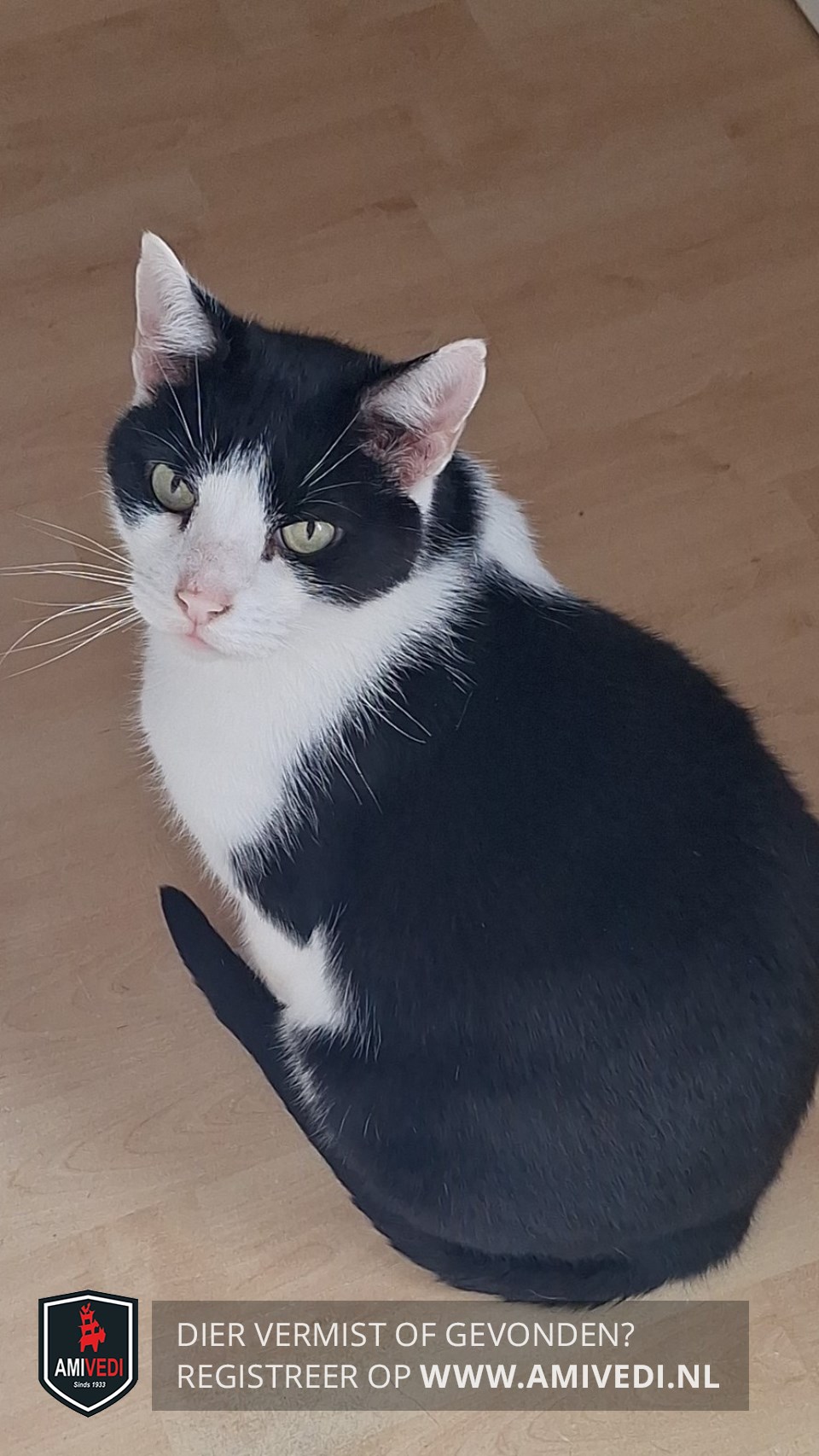 | Signalement | Zwart witte kater. Zwart bovenop de kop tot net onder de ogen. Punt linkeroor wit. Wit tussen de ogen vanaf het voorhoofd. Wit rondom neus en mond. Witte kin, bef, borst en buik. Witte loopt vanaf de borst aan beide kanten door naar de rug waar het in een punt elkaar aanraakt. Zwarte rug en staart. Linker voorpoot is wit. Hij is aan de stevige kant, licht overgewicht. |