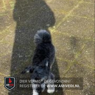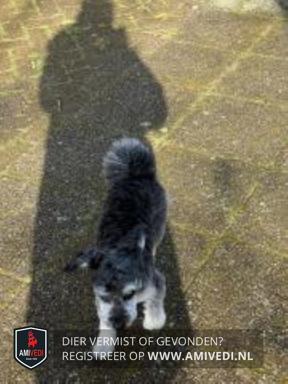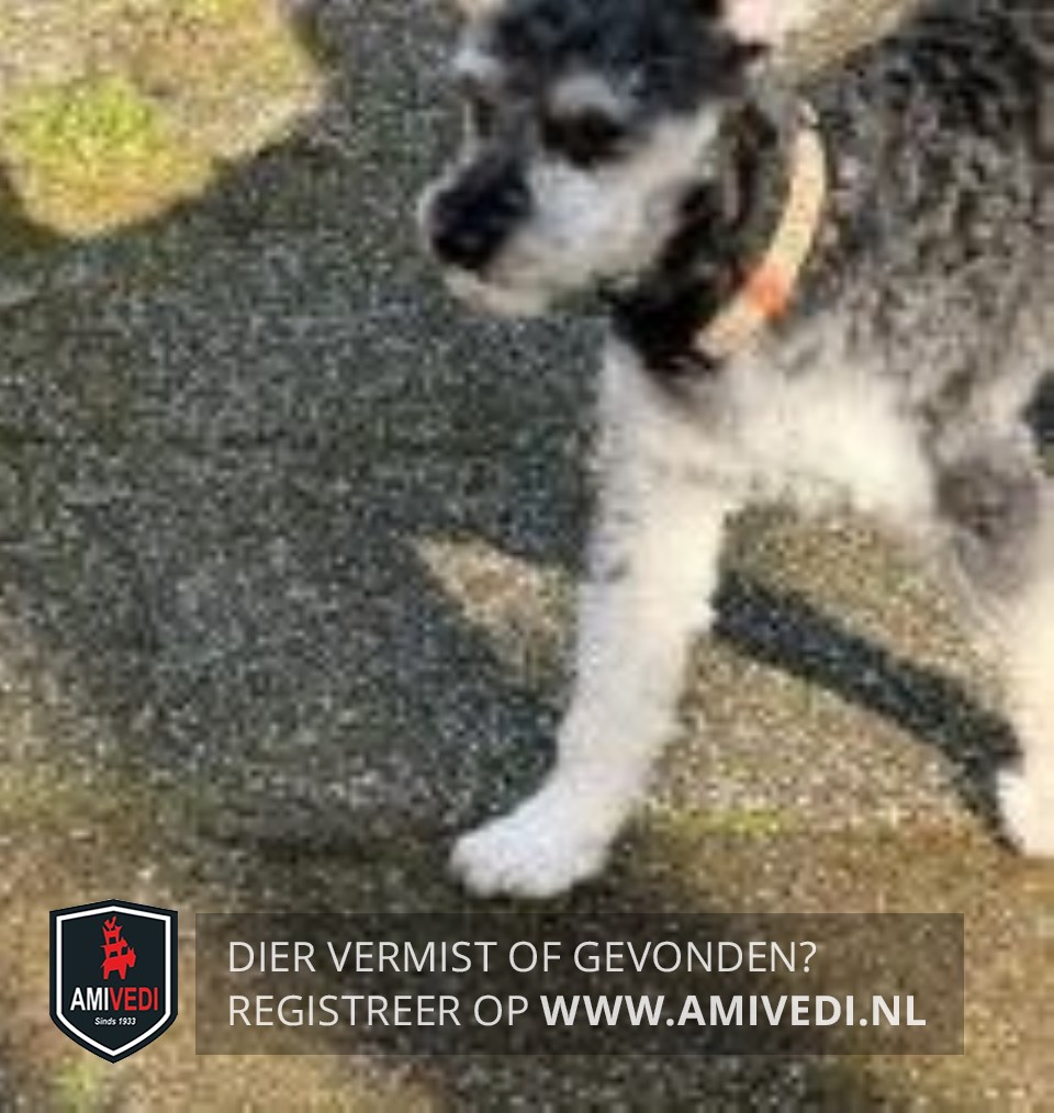 | Signalement | Grijs/zwart op het kopje, witte wenkbrauwen, grijs/zwarte neusbrug. Witte wangen en kin/hals. Grijs/zwart dek over de rug en heupen. Verder wit/grijs. Roze gekleurd halsbandje. |