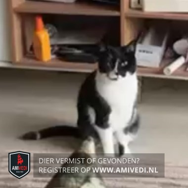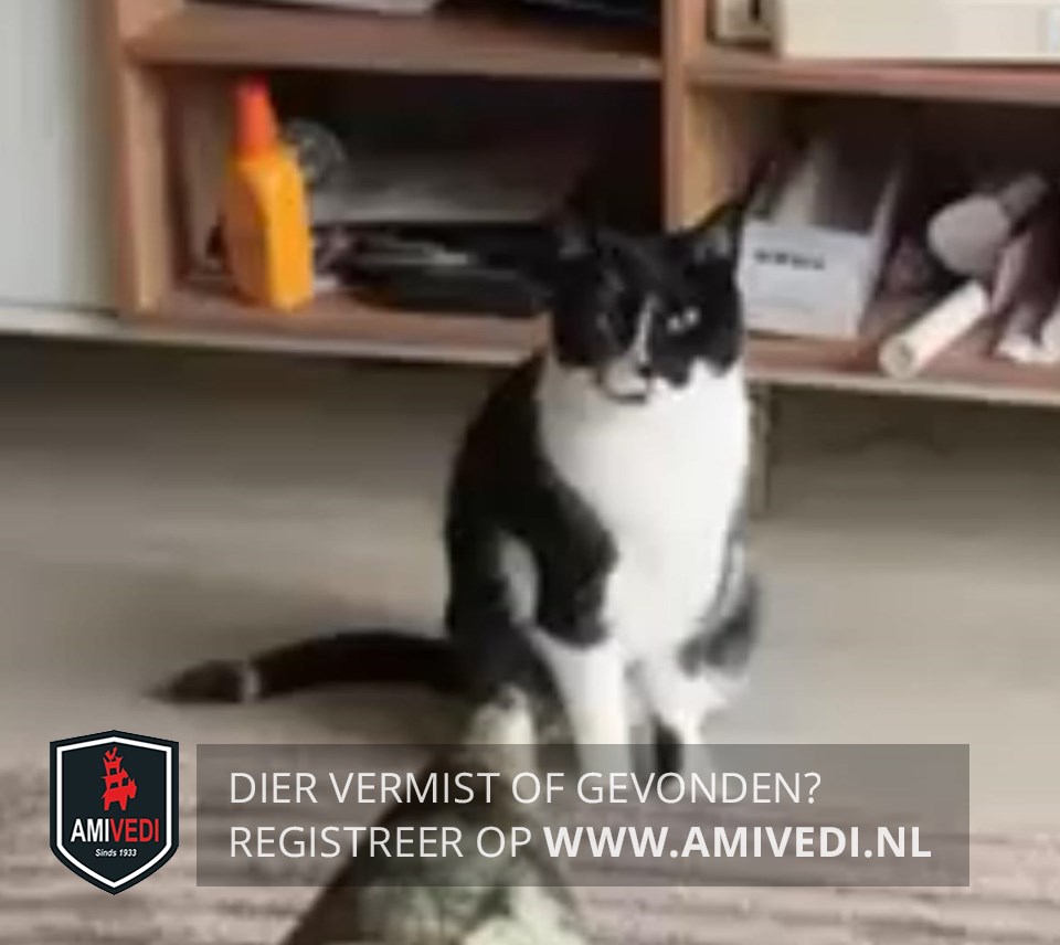 | Signalement | Zwart kopje/gezichtje, wit streepje op de neus. Witte vlek op de rechter bovenlip dat doorloopt over de kin. Beetje wit op de linker bovenlip. Witte kaaklijn, brede witte borst, witte buik. Zwart dek over de rug dat doorloopt over de schouders en heupen. Witte voorpotjes, zwart vlekje binnenkant enkel linker voorpootje. Achterpootjes witte sokjes. Zwarte staart met een wit ringetje. Wit vlekje op de billen. |