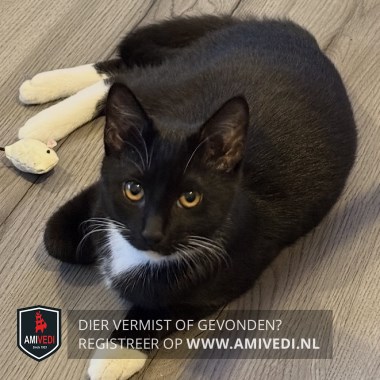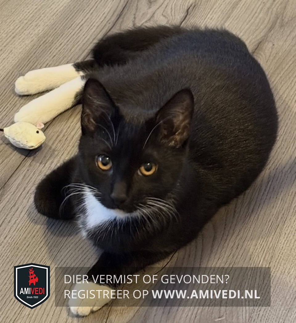 | Signalement | Zwart met een wit bef en buik en witte pootjes. Bruine ogen. |