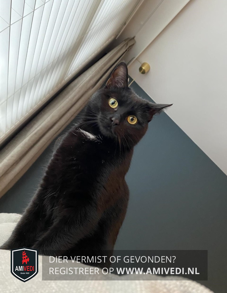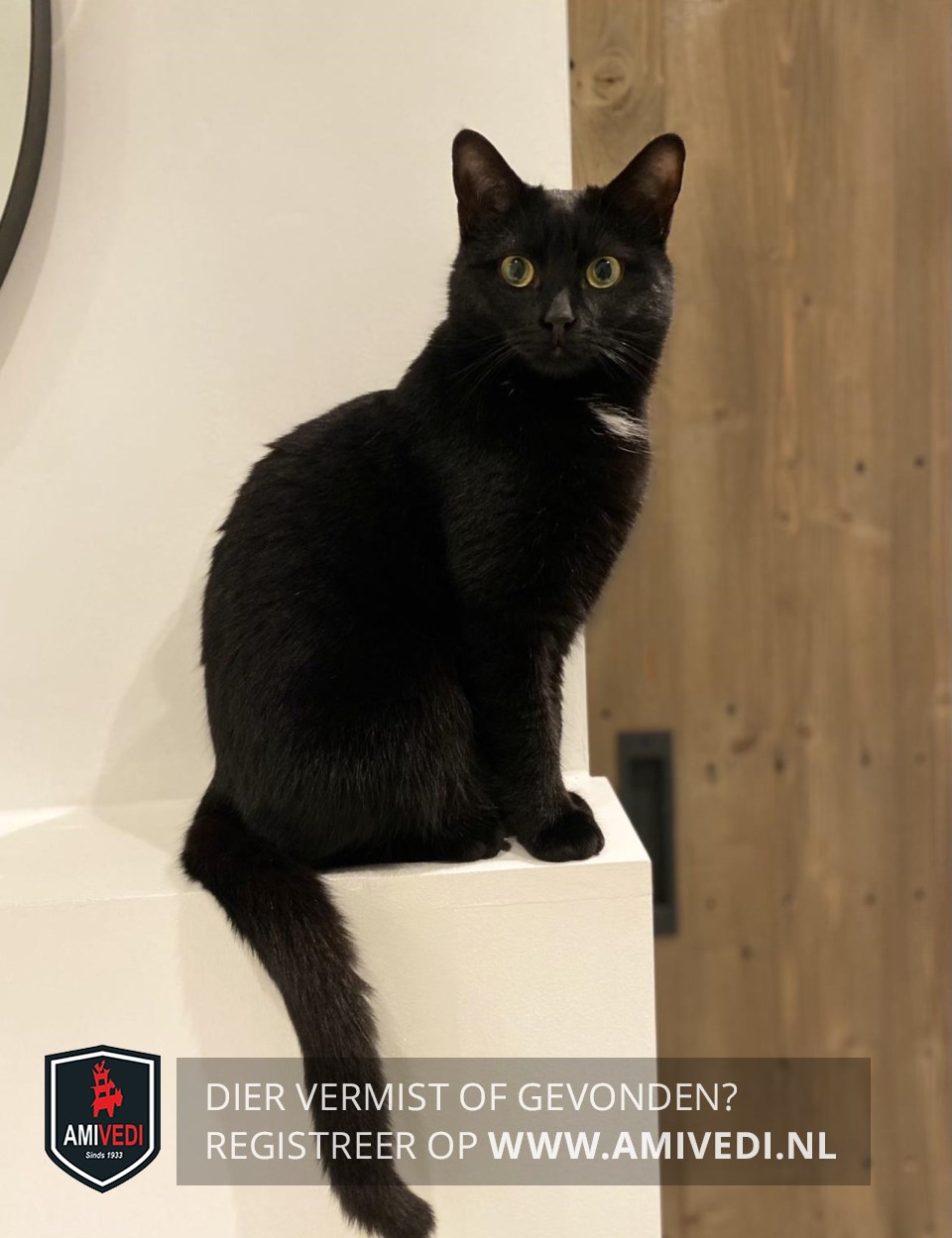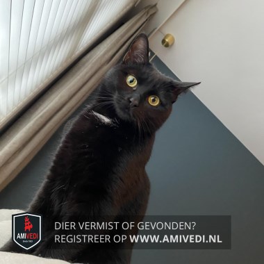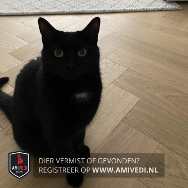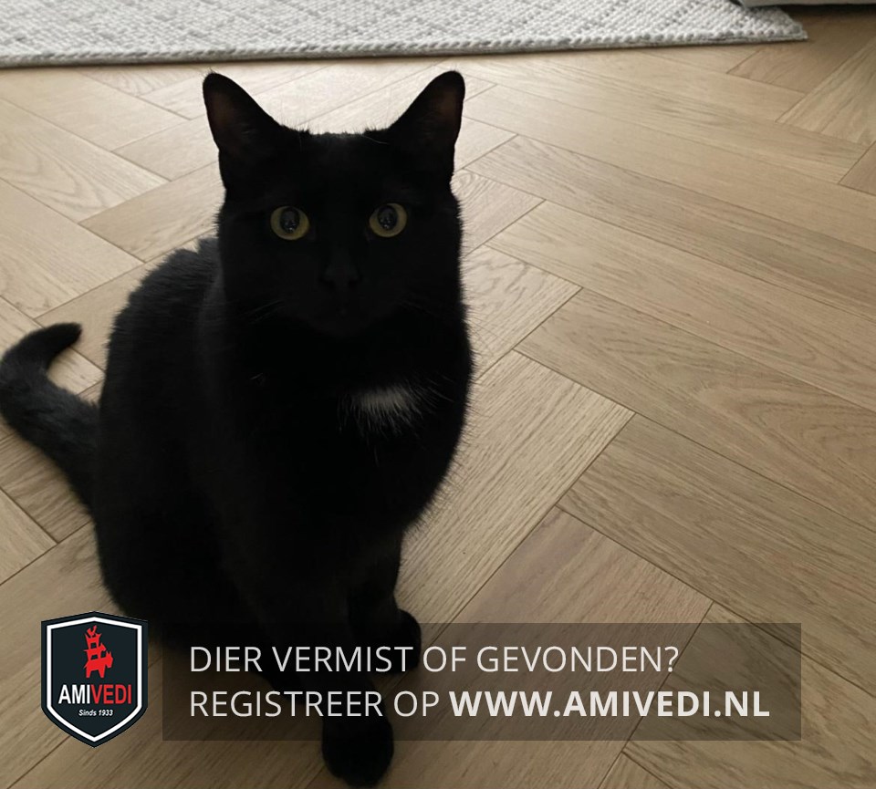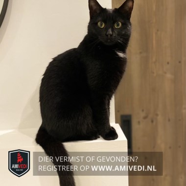 | Signalement | Volledig zwart met een klein wit plukje op de bef en gele ogen. |