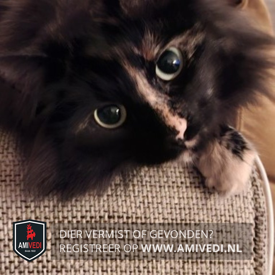 | Signalement | Zwart, bruin en rood/oranje poes. .Op de neusbrug een rood/oranje streep. Linker voorpoot een rood/oranje sok. |