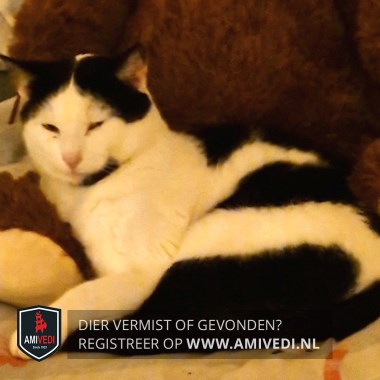 | Signalement | Wit/zwart gevlekt. 2 zwarte vlekken boven op zijn kop. Op zijkant kin zwarte vlek. Zwarte vlekken op zijn rug. Zwarte staart. |