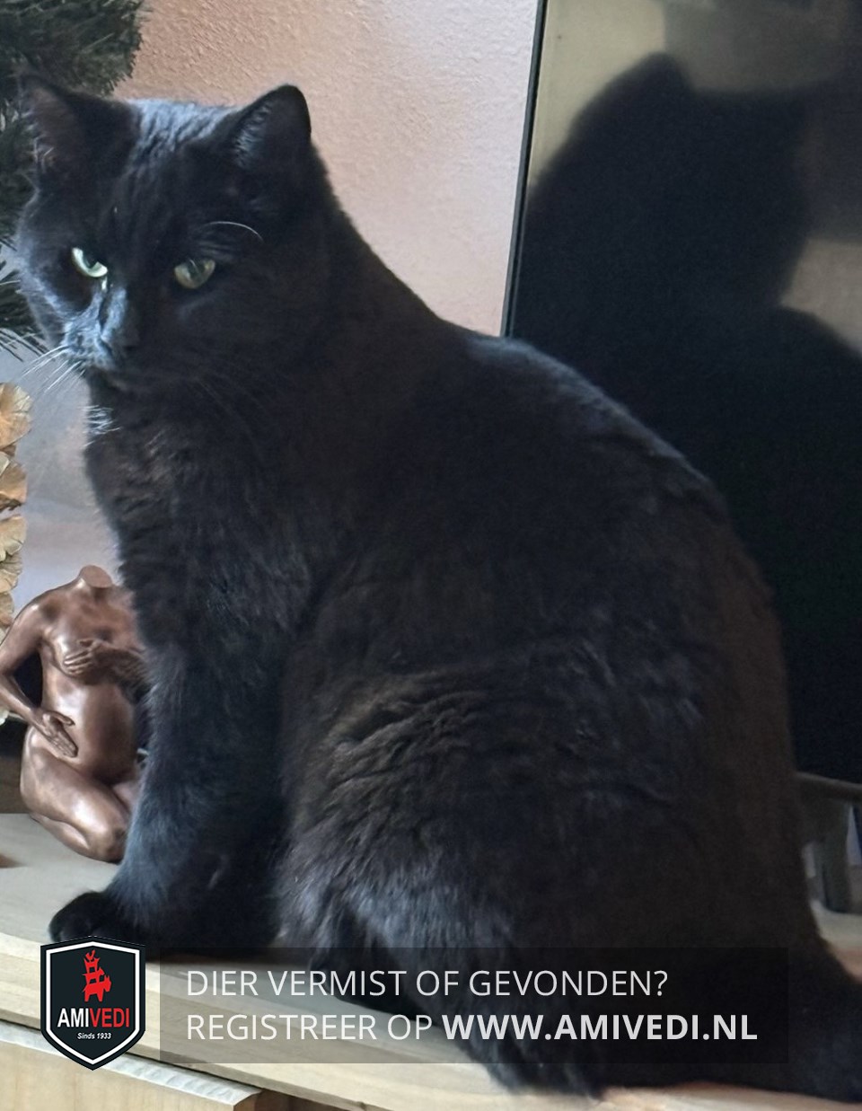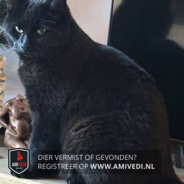 | Signalement | Zwarte kater. Klein littekentje op neus rechterkant, paar witte haartjes op de borst |