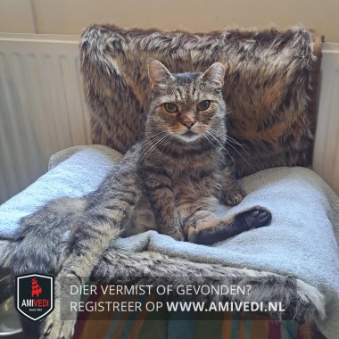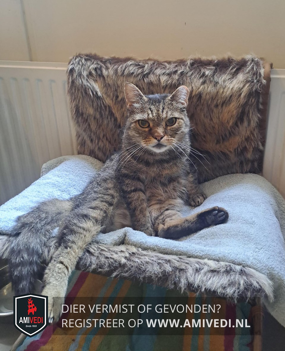 | Signalement | Cypers bruin/grijs/zwarte kater. Lichtbruin snorretje, grijs op de kaaklijn. Zwarte onderkant pootjes. |