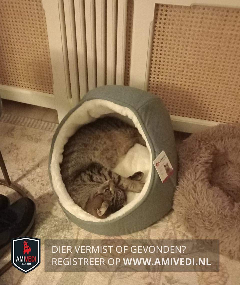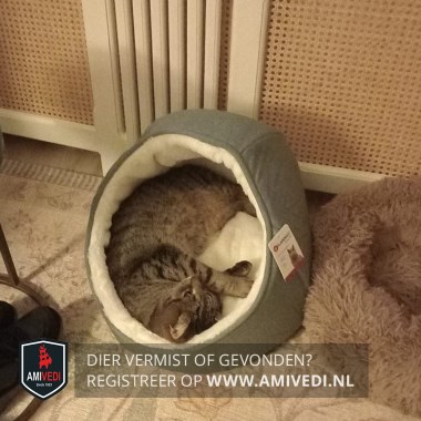 | Signalement | Gestreepte kater met aan beide achterpoten een extra teentje |
