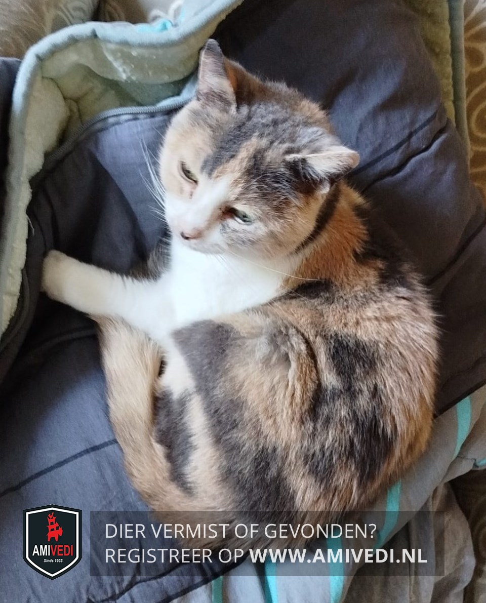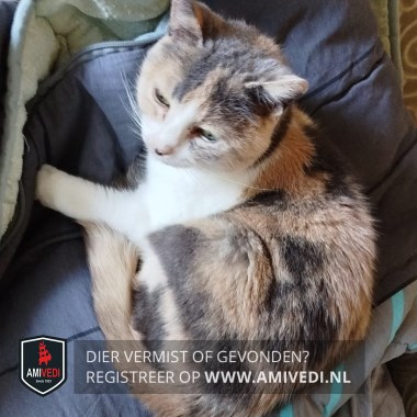| Signalement | Lapjeskat met rood, wit en zwart. Witte bles, neus, borst en voorpootjes. Rood rond de ogen, zwart rond de oren en de oren zelf, rode oorpuntjes, rood-zwarte rug, rode staart. De kat is doof. |