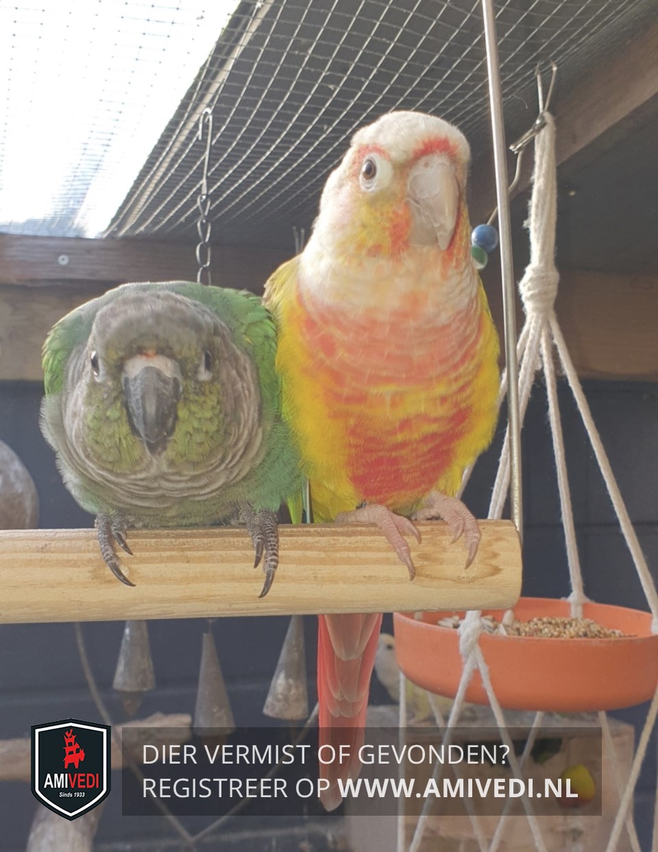 | Signalement | Op de foto de rechter Pyrrhura, beige op het kopje, rood/oranje streepje boven de beige snavel. Rond de oogjes beige. Wat geel/oranje op de wangen, beige hals. De borst is oranje/rood met wat geel. Gele vleugels met groen. |