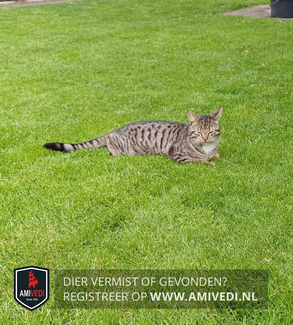 | Signalement | Cypers gestreept. Witte kin en bef. Zwarte punt aan staart. |