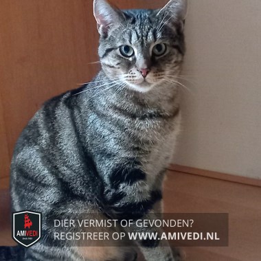 | Signalement | Grijs/zwart (gestreepte) poes met wit, wit bij de kin en borst, duidelijke zwarte strepen en vlekken over het hele lijf, bruine ondertoon bij de buik. |
