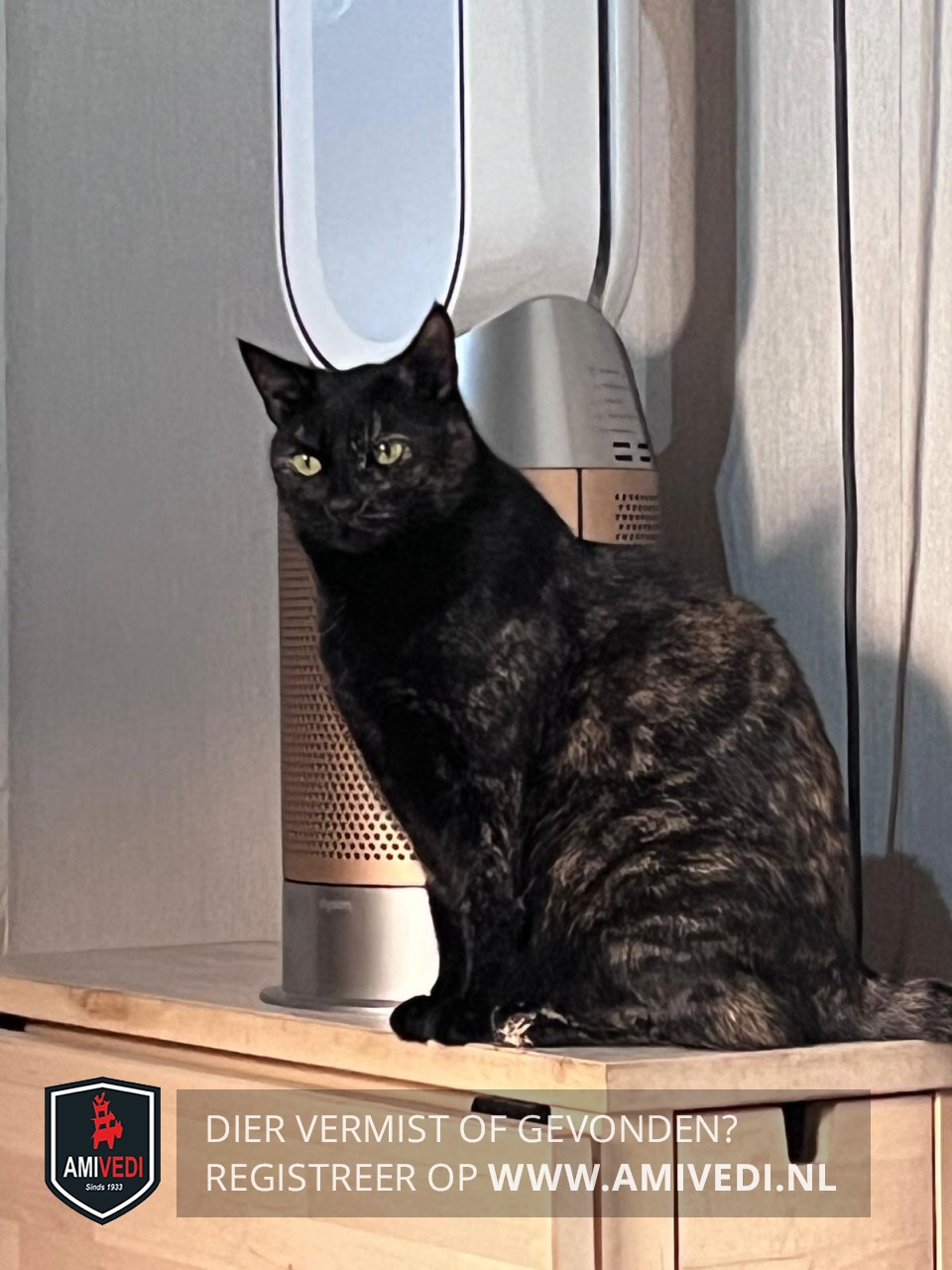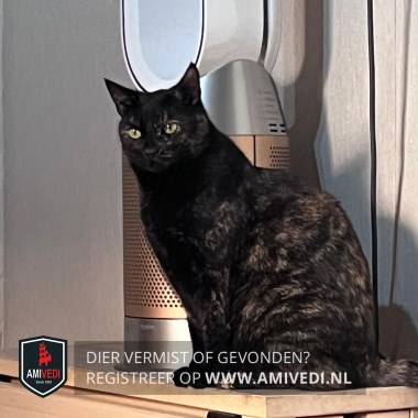 | Signalement | Poes is zwart met rood/oranje vlekjes, met name op het achterlijf en ze is wat te dik. |