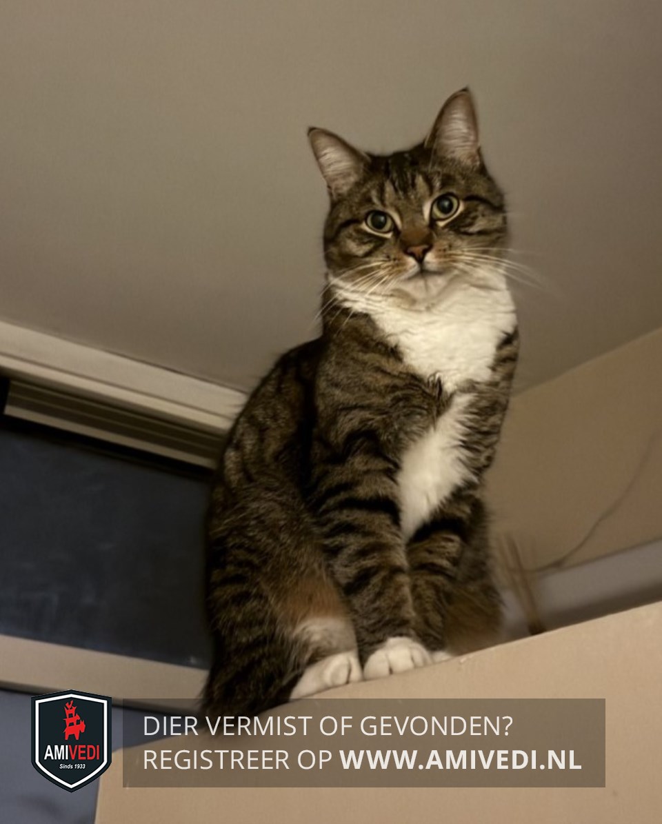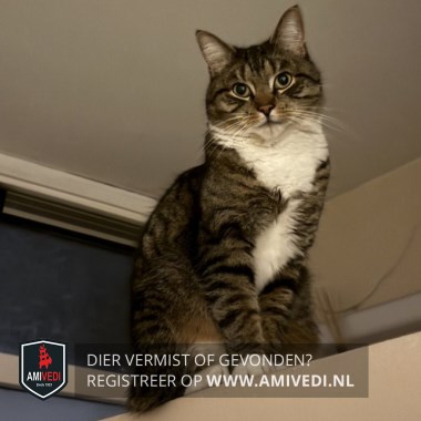 | Signalement | Cypers bruin zwart gestreepte kater met een bruine neus waar een wondje aan zit. Wit rondom de bek, witte bef en borst, witte onderkant met een gestreept lijfje. Aan de voorpootjes witte sokjes en aan de achterpootjes witte laarsjes. |