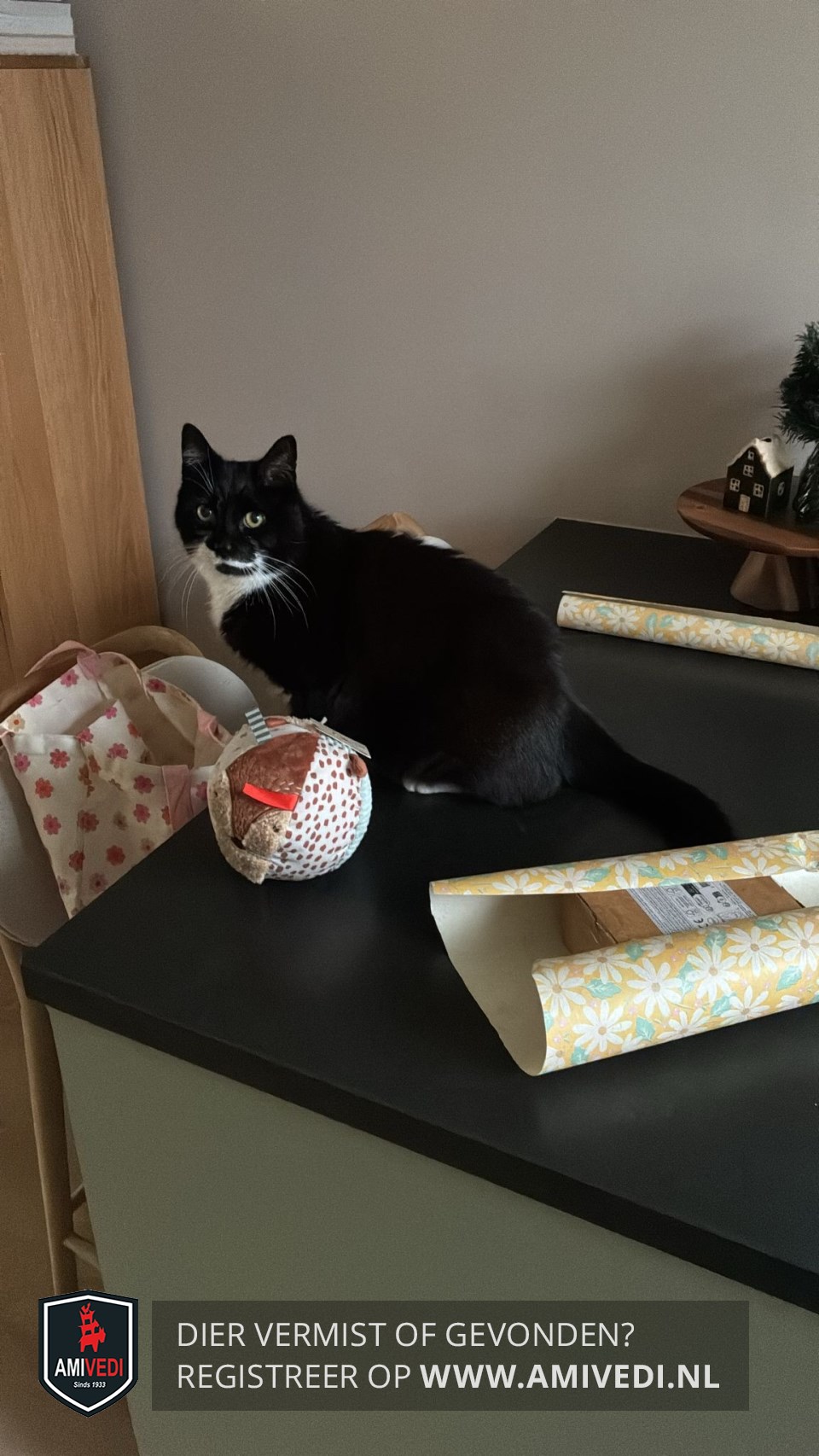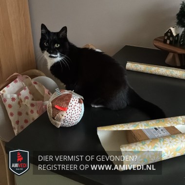 | Signalement | Kop zwart, witte horizontale streep onder de neus, kin zwart. Witte bef. Aan 1 van de poten een lange witte sok. Hij kan wat angstig en schuw zijn, dus mogelijk heeft hij zich ergens verstopt. |