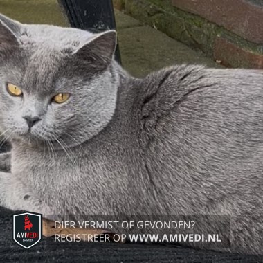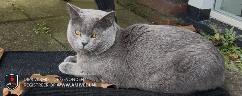 | Signalement | Grijs met zwart neusje en oranje ogen. |
