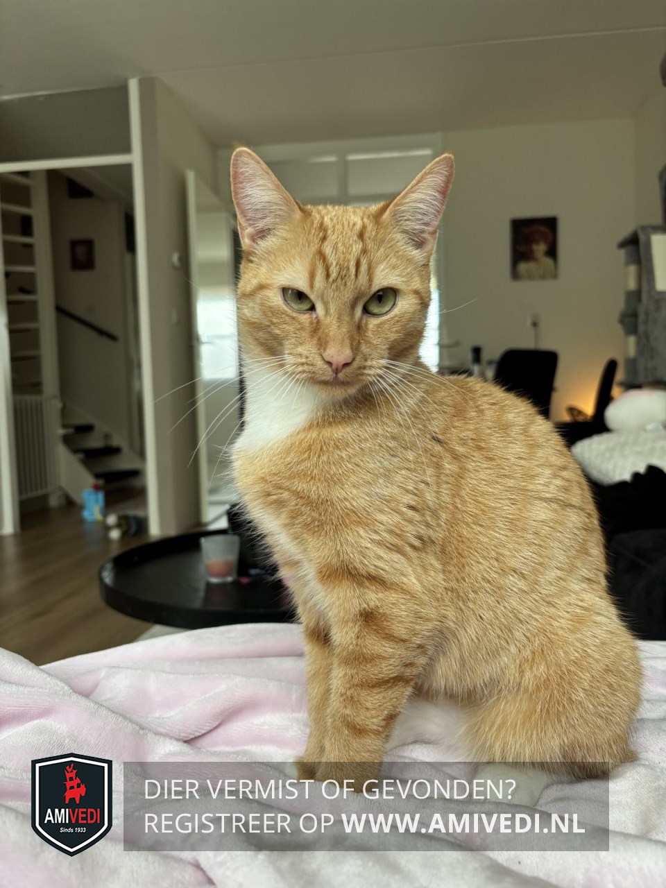 | Signalement | Cypers rood gestreepte poes met wat wit aan de bek en kin. Witte bef en borst en wat wit aan de buik, met een volledig gestreept lijfje. Aan de voorpootjes witte teentjes en witte laarsjes aan de achterpootjes. |