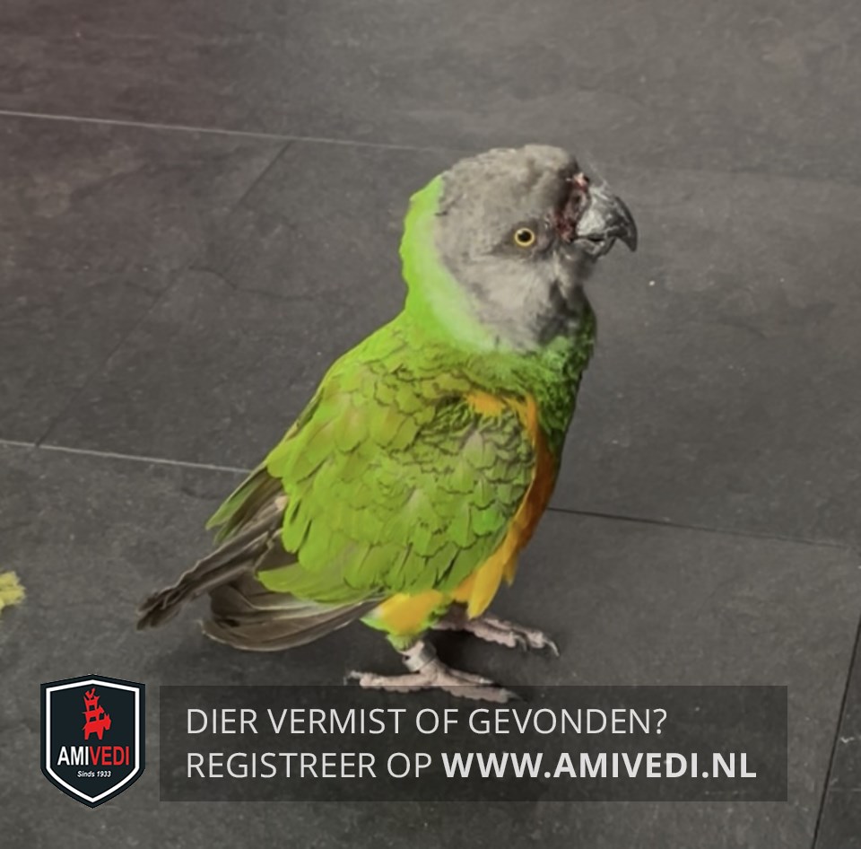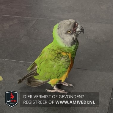 | Signalement | Papegaai groen geel met grijze kop |