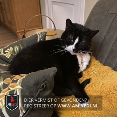 | Signalement | Zwart/witte poes. Voornamelijk zwart. Wit streepje op de neus, witte vlek rechts naast de neus dat doorloopt over de kin. Witte bef en witte teentjes. Rose halsbandje met adreskokertje om. |