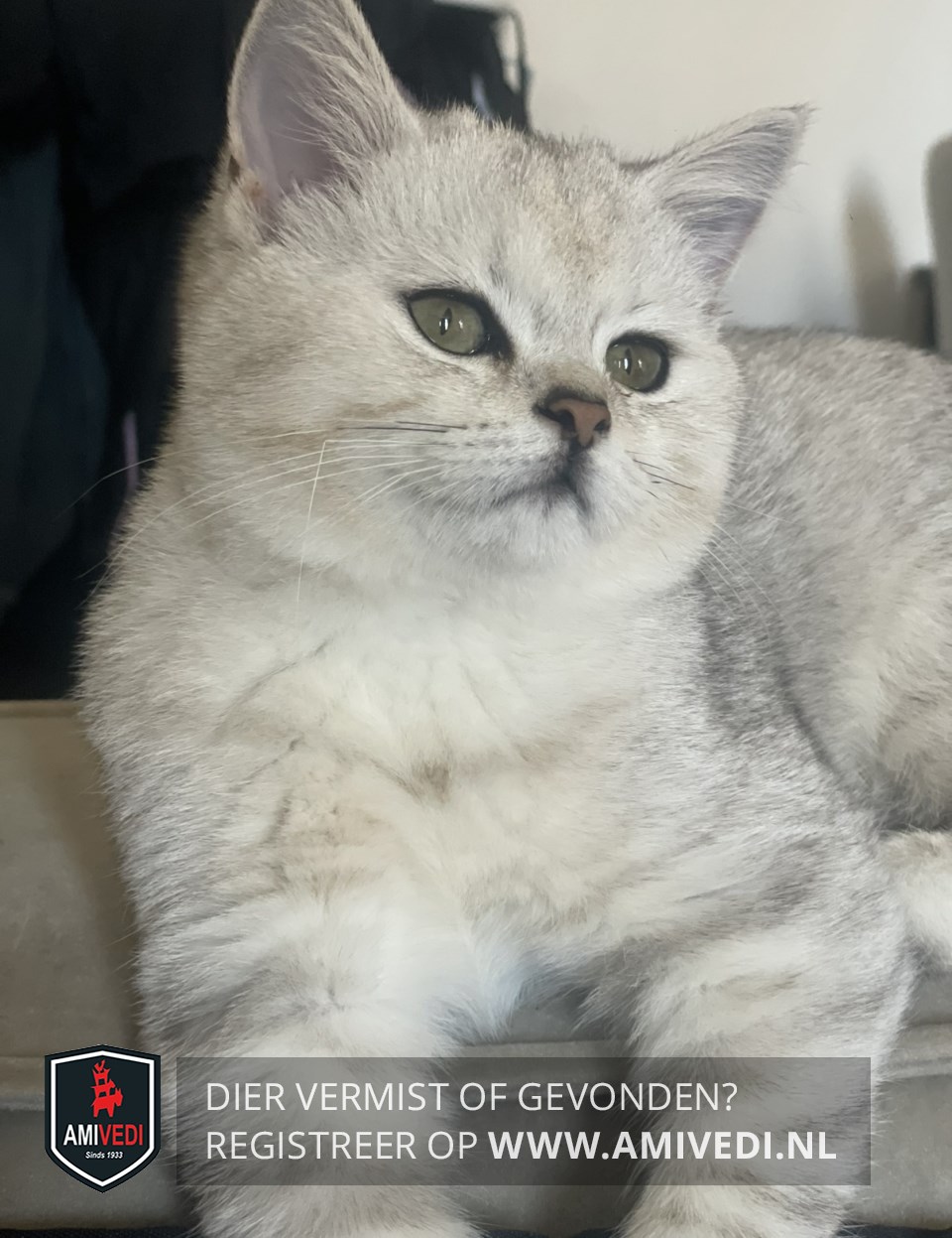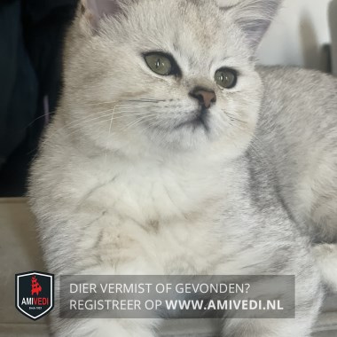 | Signalement | Wit/grijs/beige cypers/gemêleerd poesje, dikke vacht, groenige oogjes. Donker neuspuntje. |