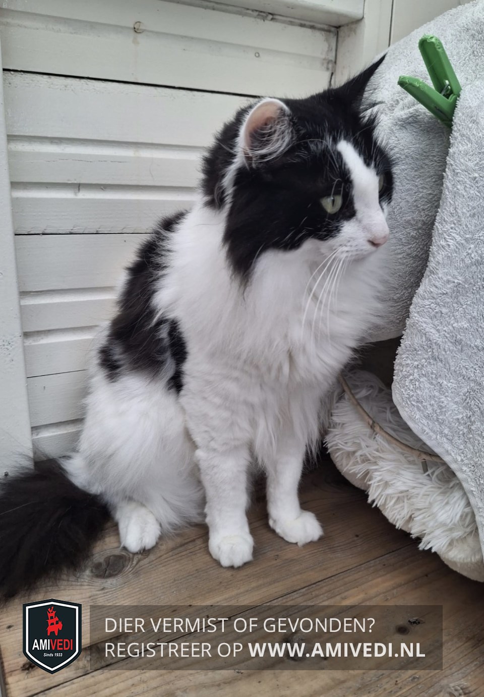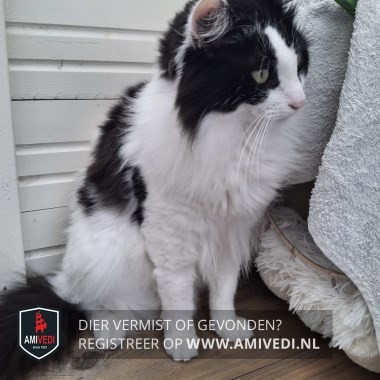 | Signalement | Zwart/witte kater. Kruising Noorse boskat. Overwegend wit met zwarte vlakken: zwart petje bovenop de kop tot in de hals, zwart vlak op rug en flanken en een dikke zwarte pluimstaart. |
