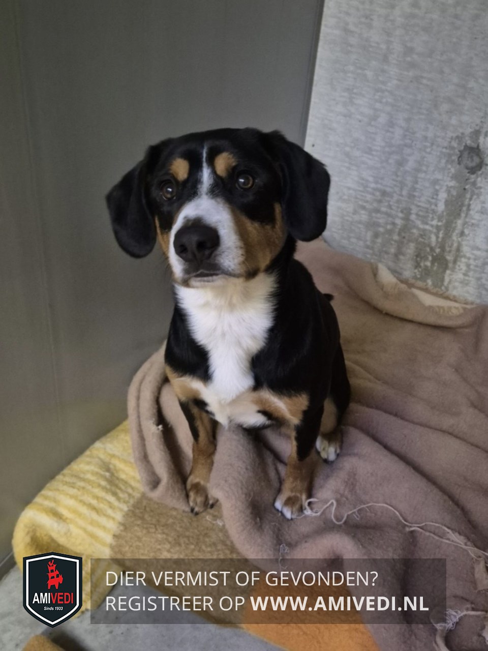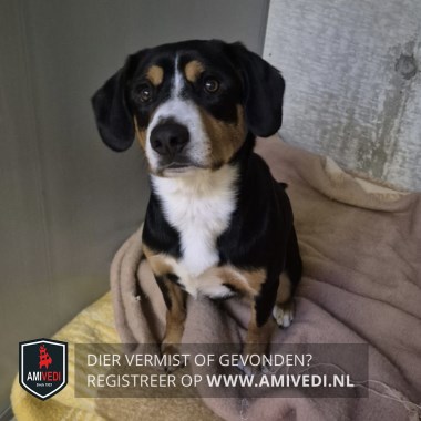 | Signalement | Vermoeden is een jonge Entlebucher Sennenhond. Boventoon is zwart, witte snuit, bruine wangen. Witte borst met streep naar de buik en bruin aan de wenkbrauwen en poten. |