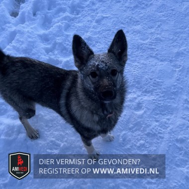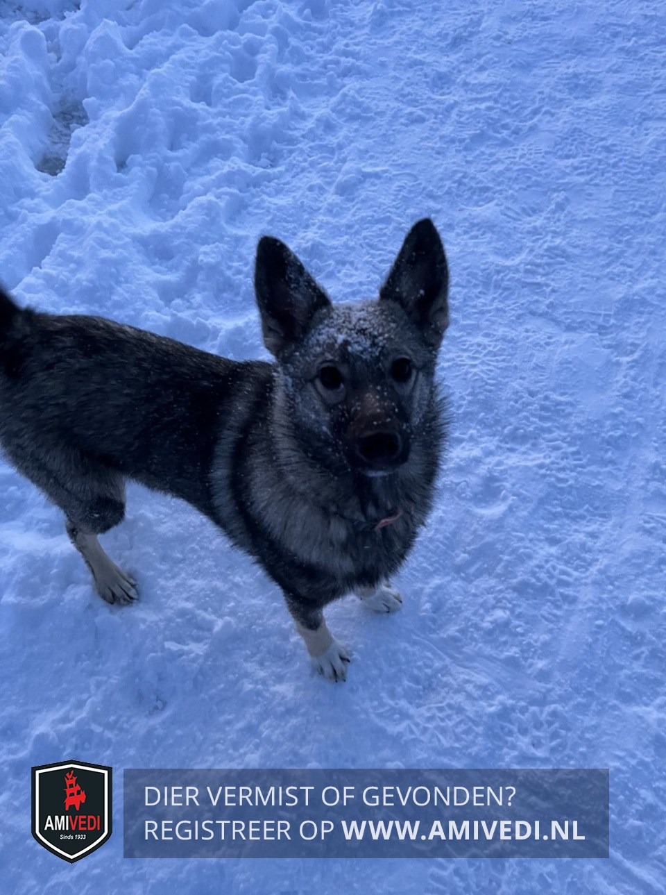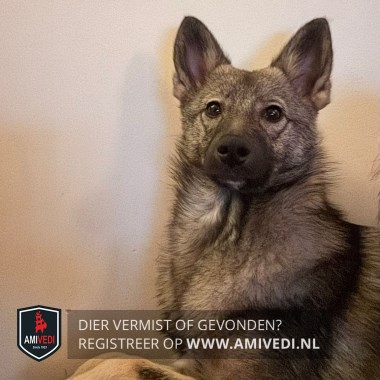 | Signalement | Kruising keeshond met kleine herder. Lijkt vooral op een kleine herdershond. Donker grijze snuit. Lichter grijs bovenop de kop, voorhoofd, rondom ogen en zijkant van de kop. Nek kraag en borst licht grijs. Alle 4 de pootjes hebben beige/licht grijze sokjes. |