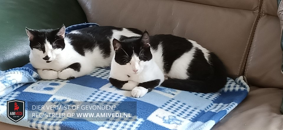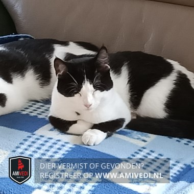 | Signalement | Zwart over de kop, grote vlek op de rug, vlek achterhand doorlopend naar de staart, vlekken op de beide voorpoten, stipje op de borst. Witte snoet, borst, buik, voetjes voorpootjes. |