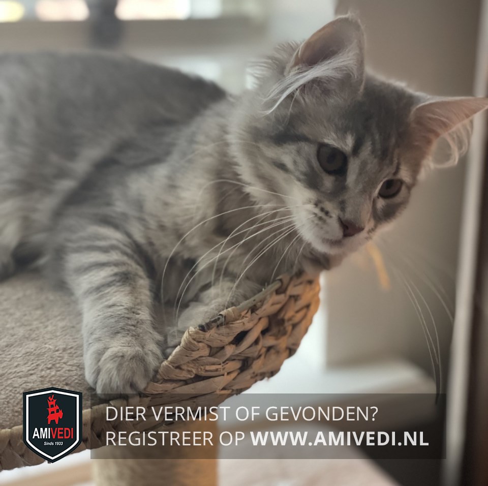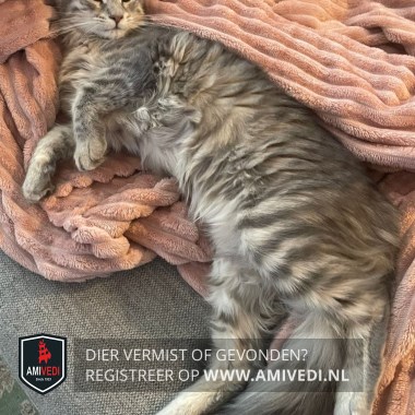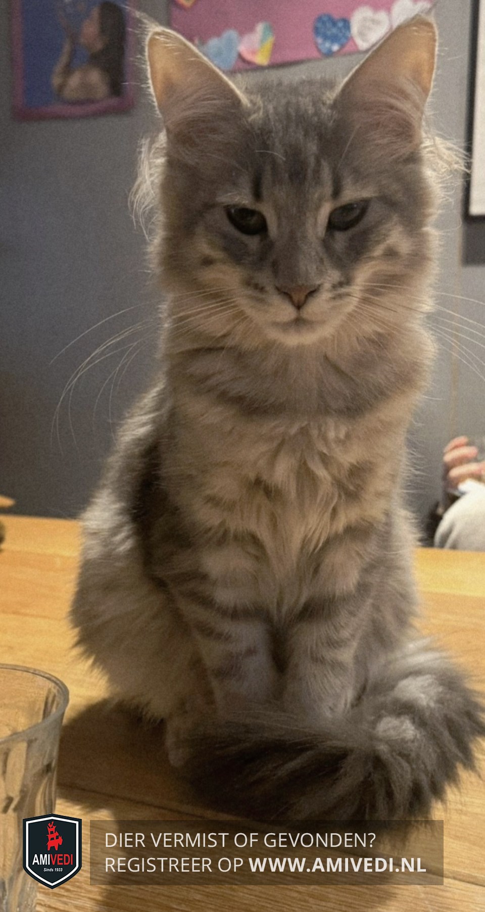 | Signalement | Cypers grijs gestreepte (blue tabby mackerel) Maine Coon poes. Veel lang haar in de oren en een pluimstaart. Bij chip uitlezen graag contact met ons opnemen voor info. |