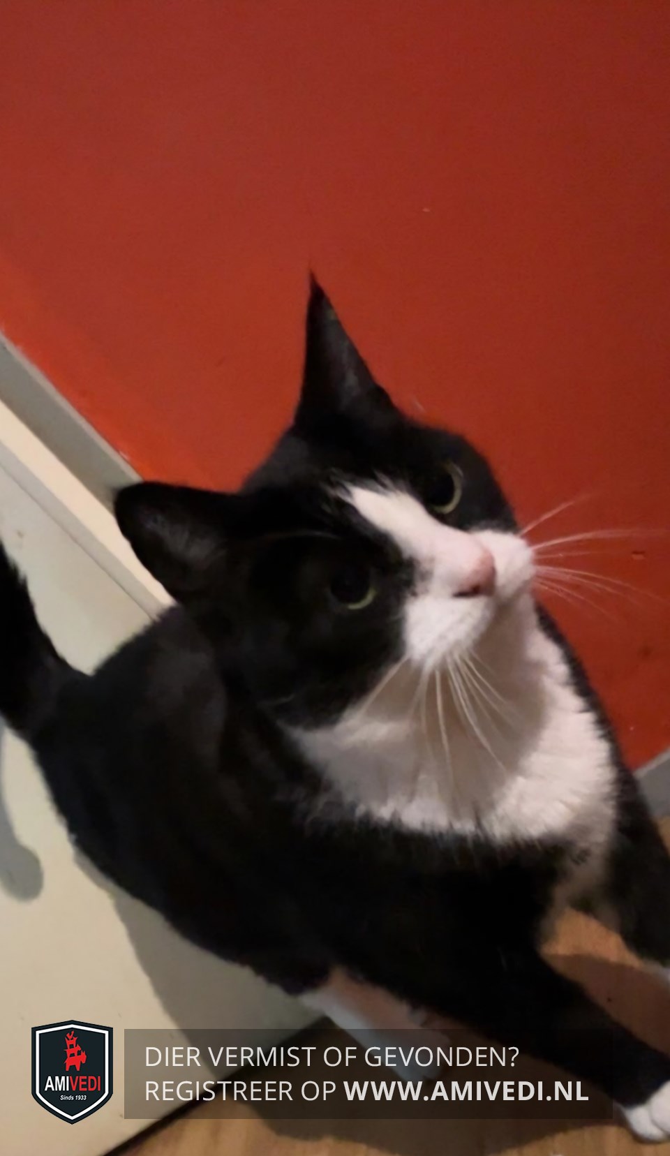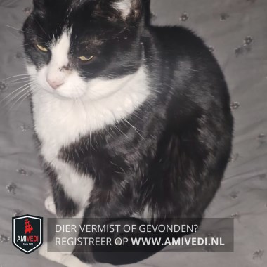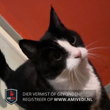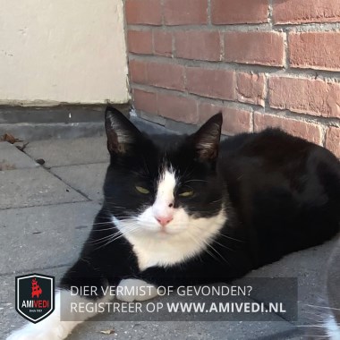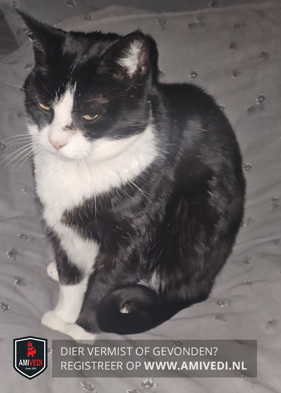 | Signalement | Zwart met witte snuit en kin/bef. Rechter voorpoot wit en linker voorpoot wit voetje. |