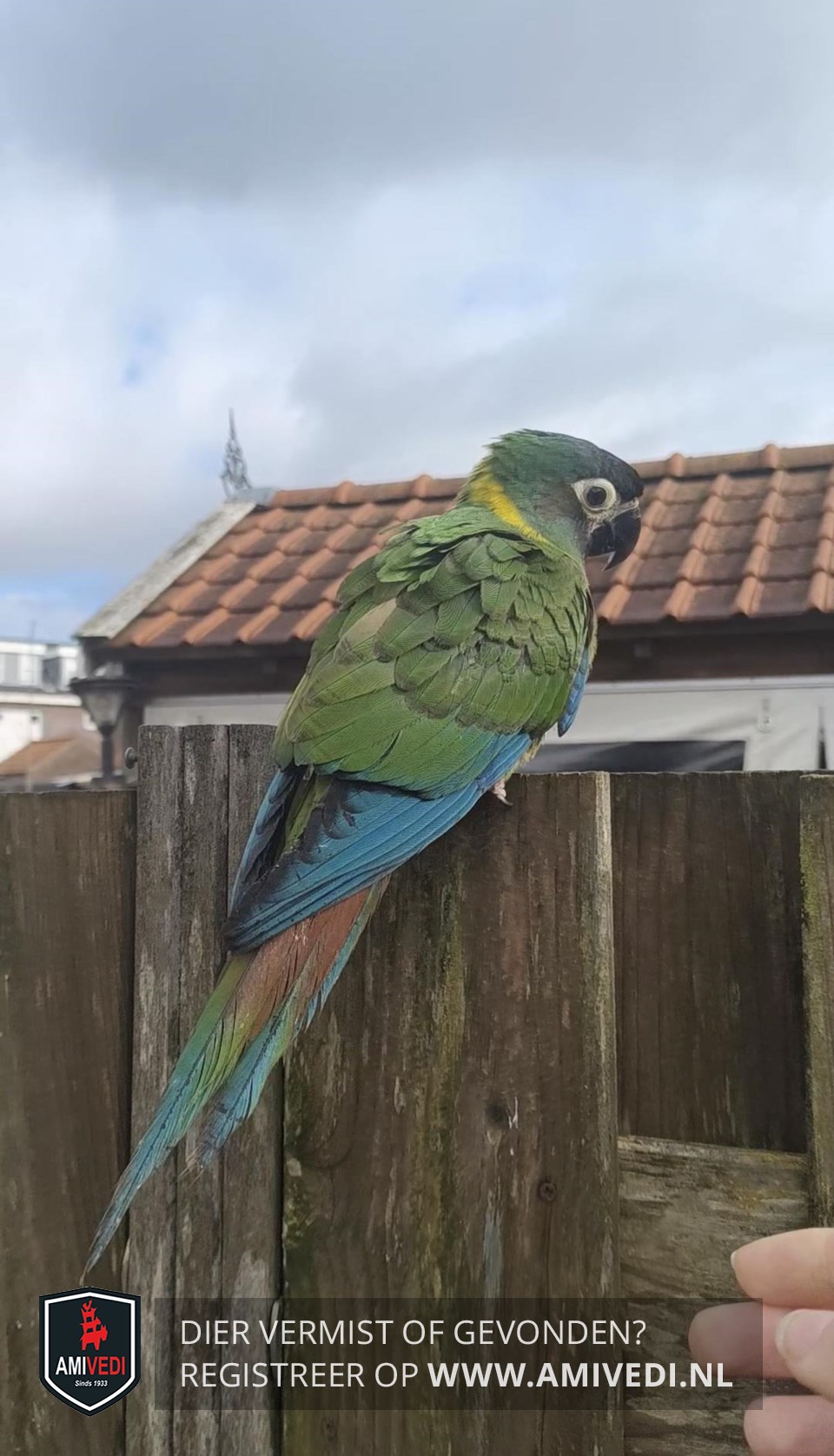 | Signalement | Geelnek ara. Heeft medische probleem Zwarte kop geel in de nek Groene lichaam Lange staart Zwarte ring De vogel is ook gechipt. |
